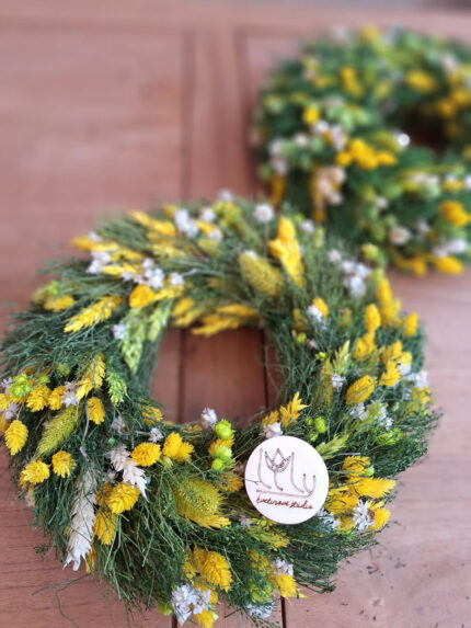 Tento jedinečný ručne viazaný venček je zo sušeného materiálu.