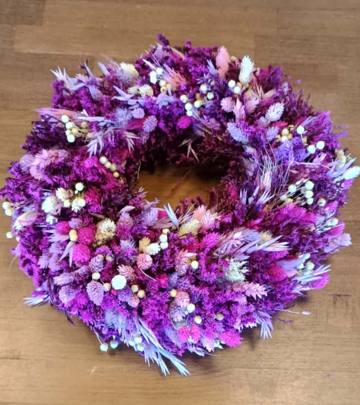Tento jedinečný ručne viazaný venček je zo sušeného materiálu.