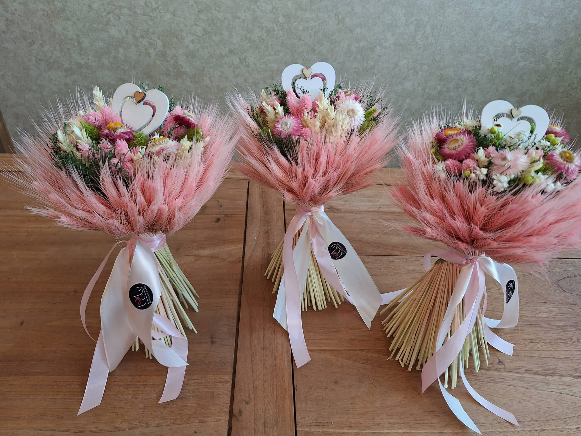 Stredná gratulačná sušená kytica je ideálny darček. Je vhodná ako náhrada na gratuláciu za čerstvé kvety. Kytica vydrží niekoľko rokov. Doplnená je o drevené srdiečko a elegantné saténové stuhy.