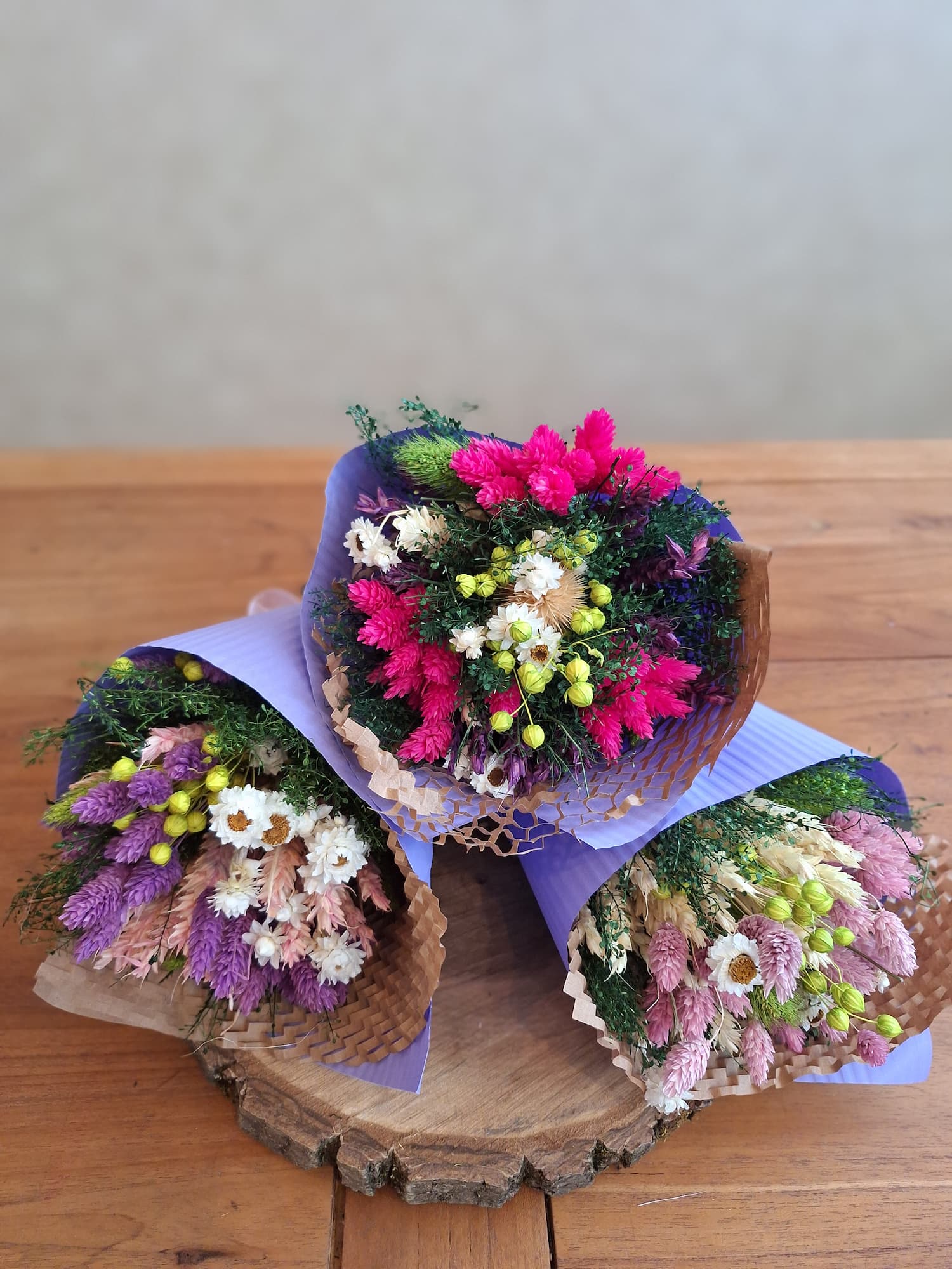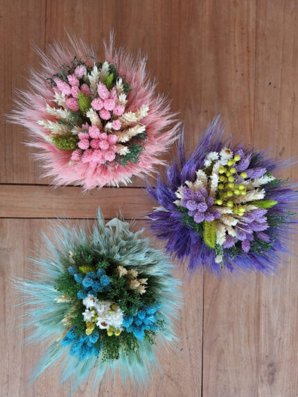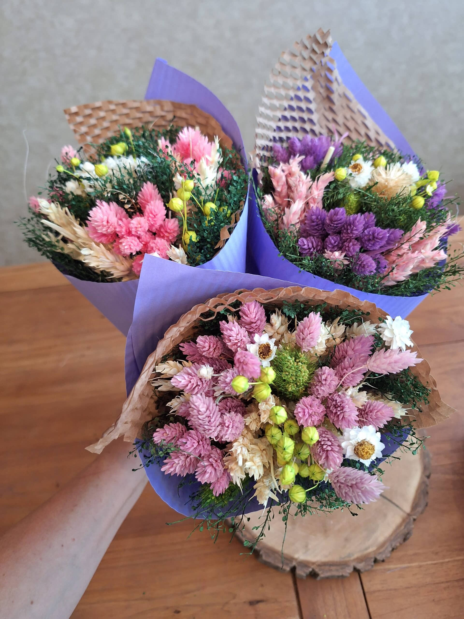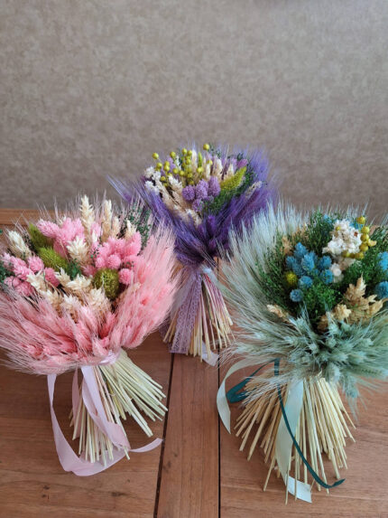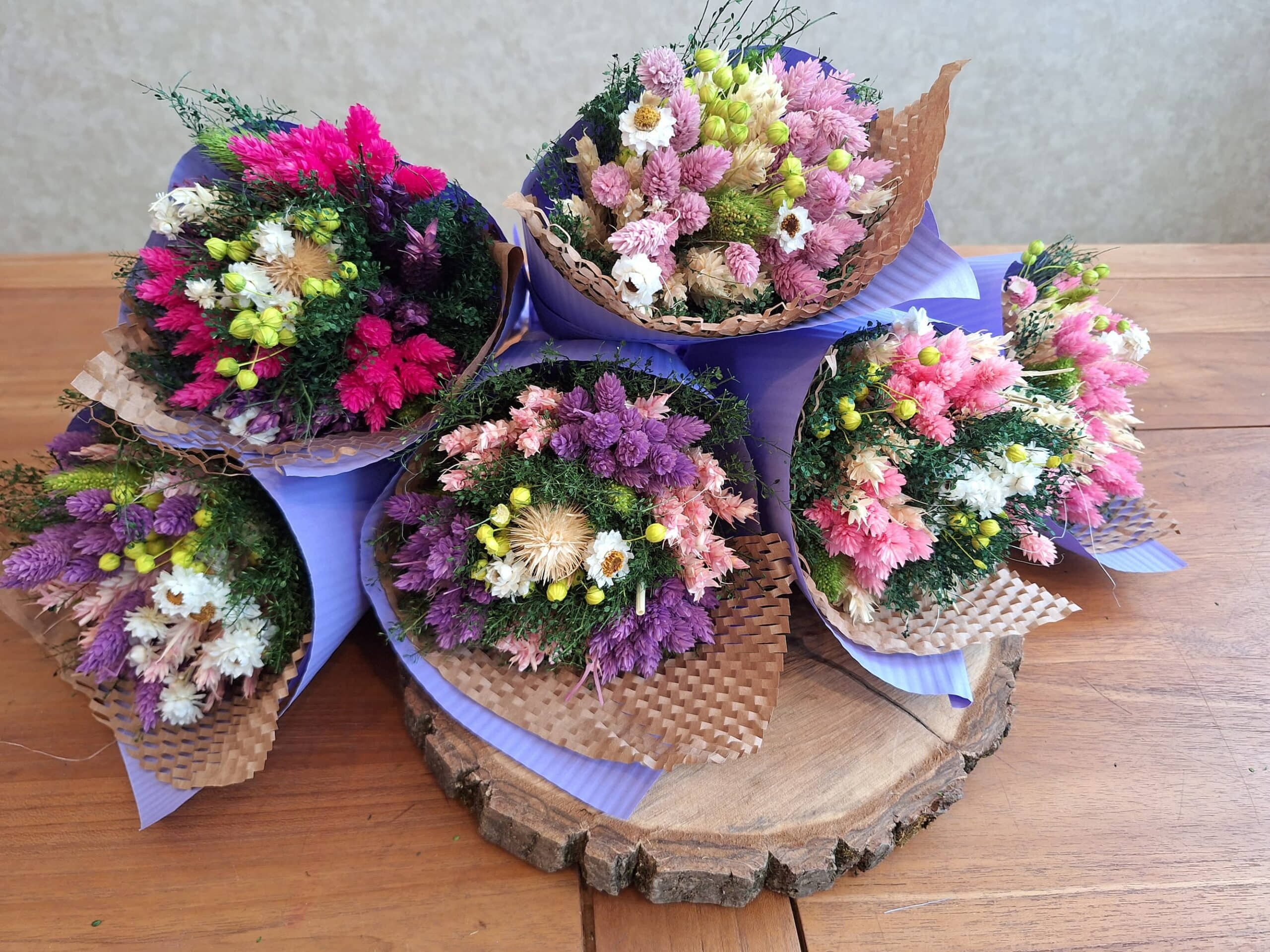 Kvety sú sušené zviazané do kytice, zabalené do ozdobného papiera.