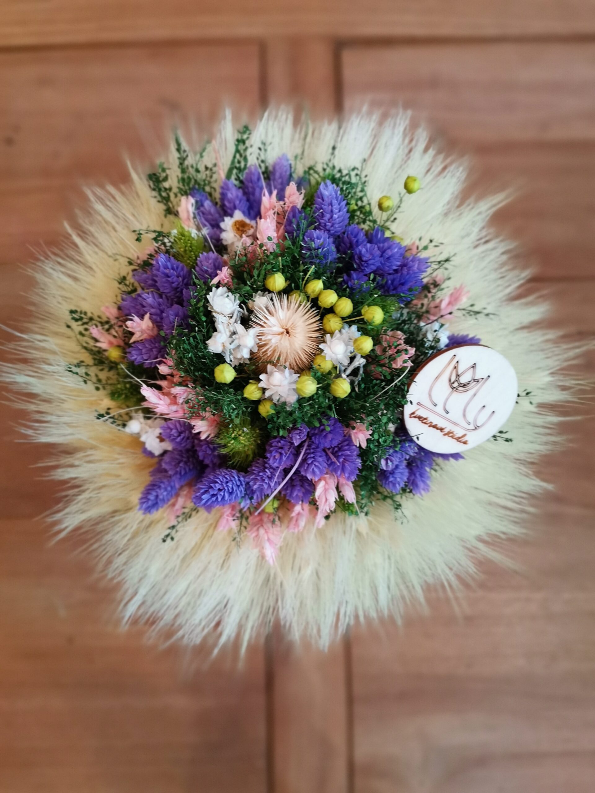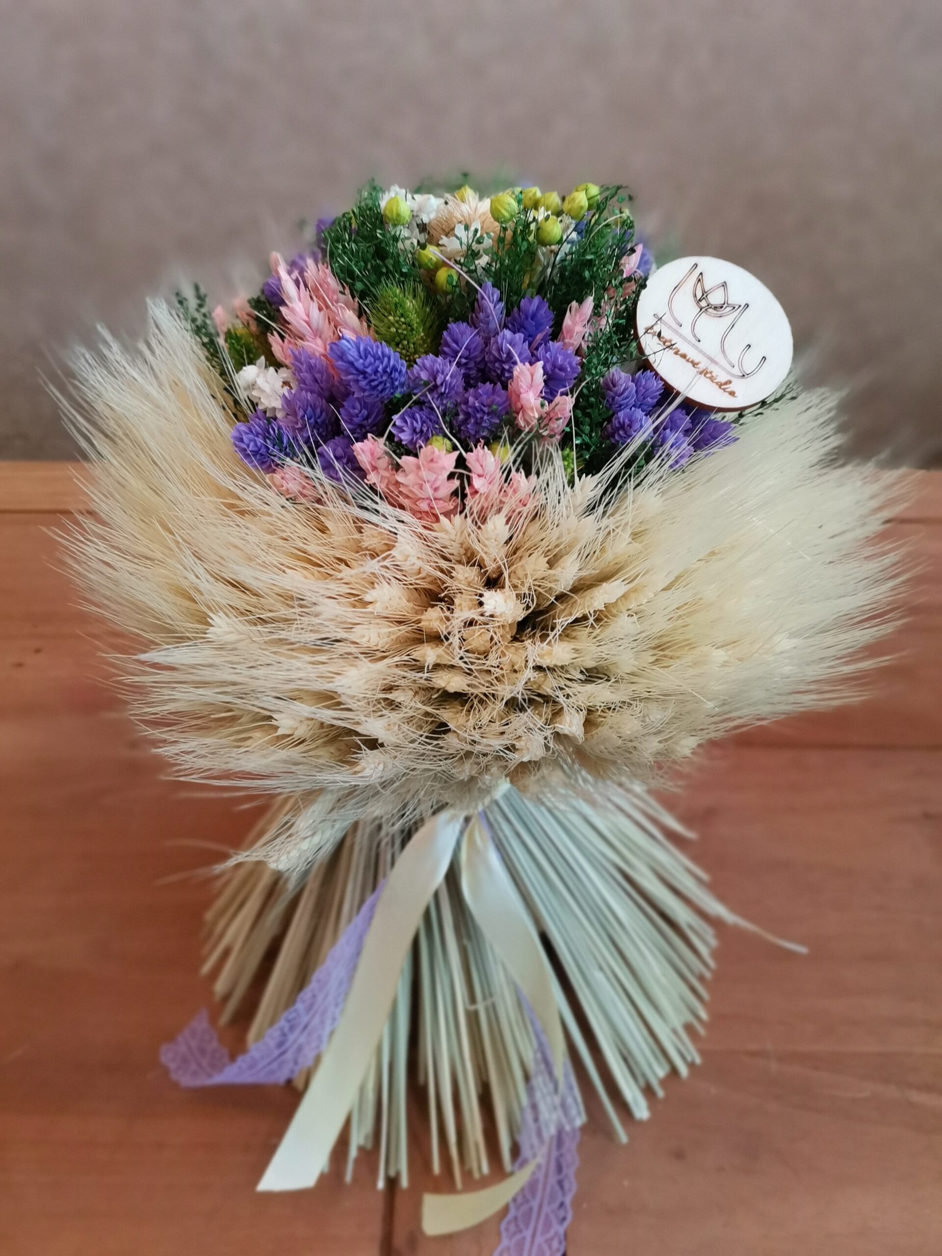 Veľka kytica je samostojacia dekorácia ideálna ako dekorácia na stred stola. Kytica je ručne viazaná z obilných klasov a sušených kvetov, doplnená o rôzne stuhy.