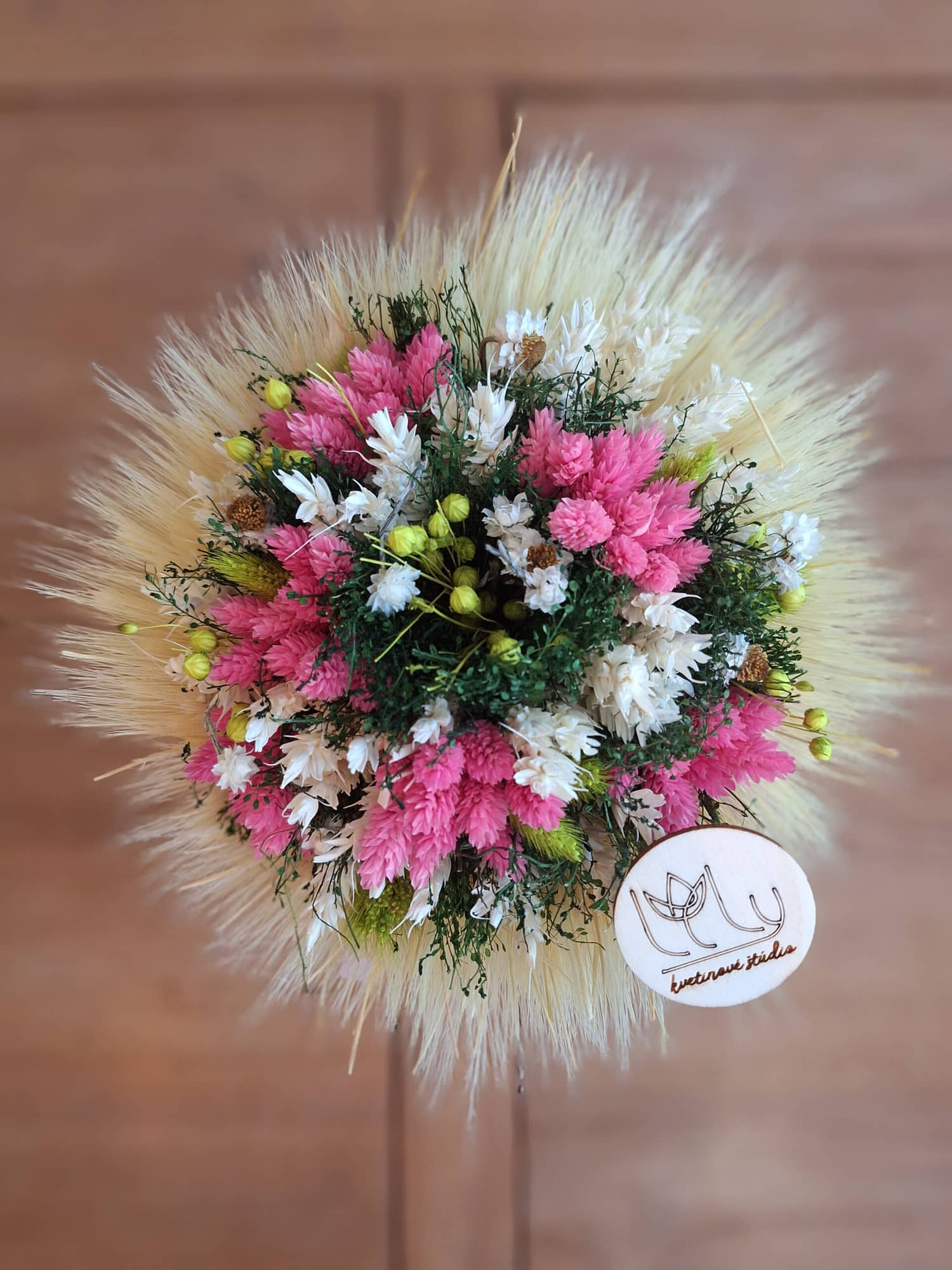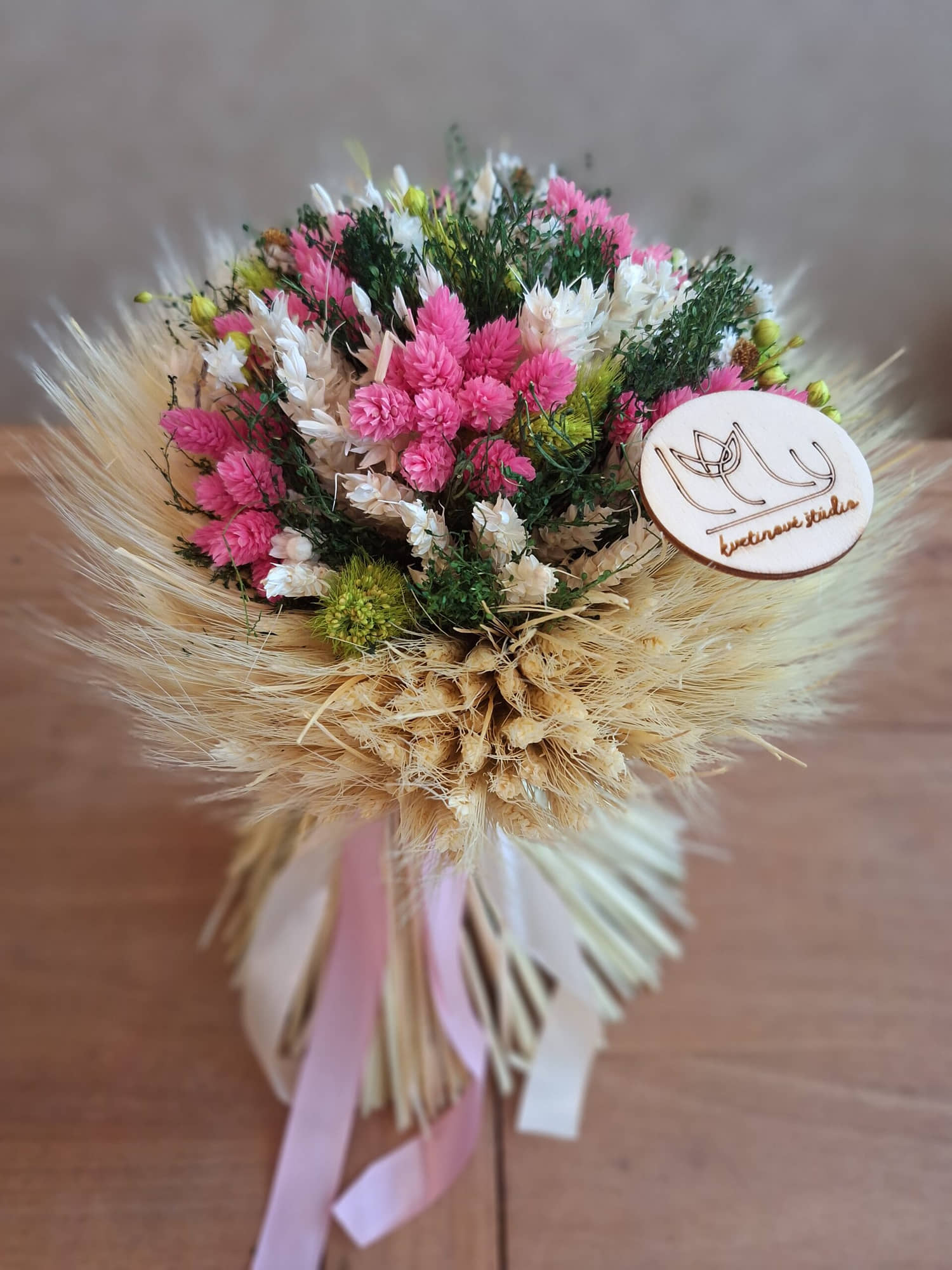 Kytica je ručne viazaná z obilných klasov. Vnútro tvorí mix sušených drobných kvetov.