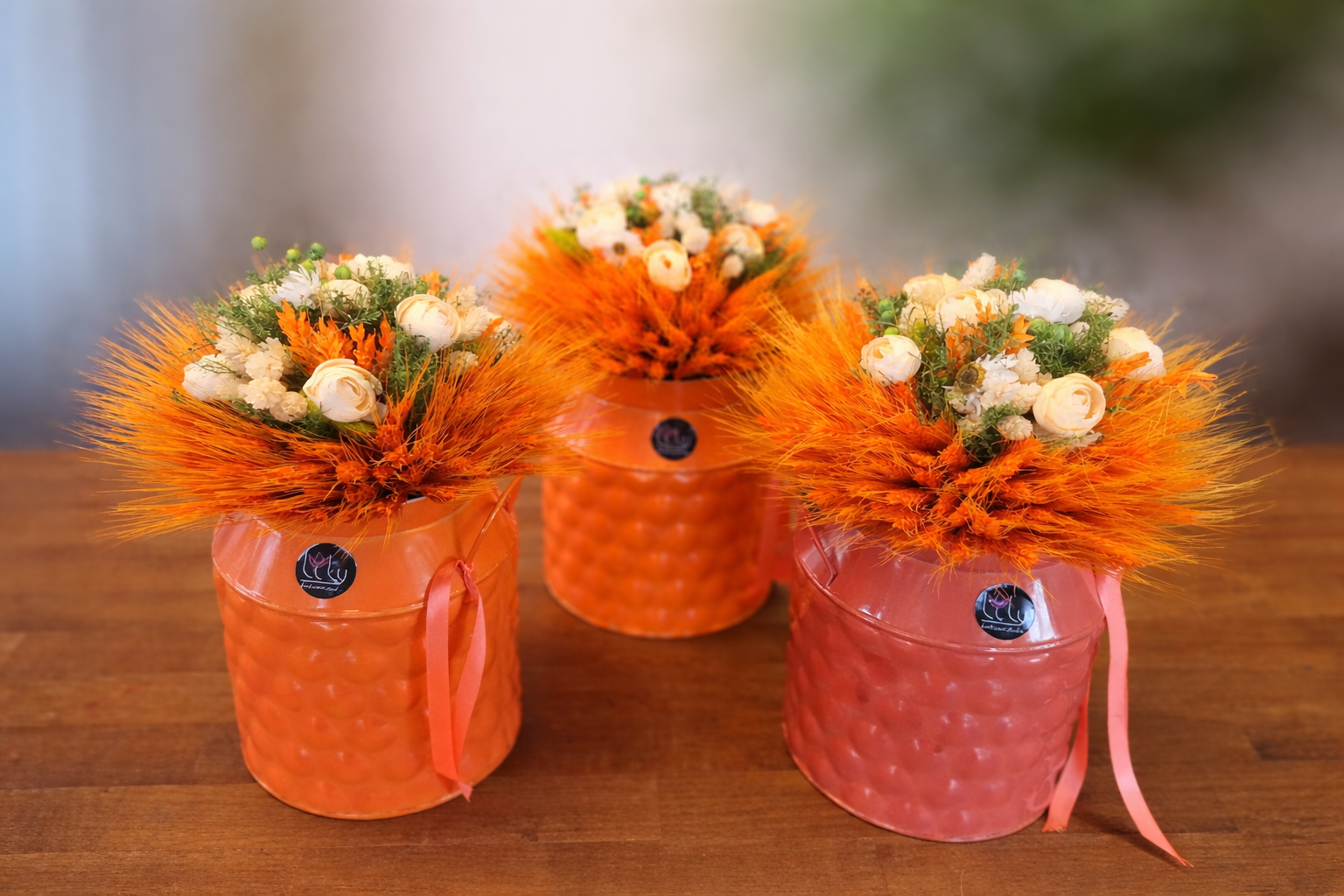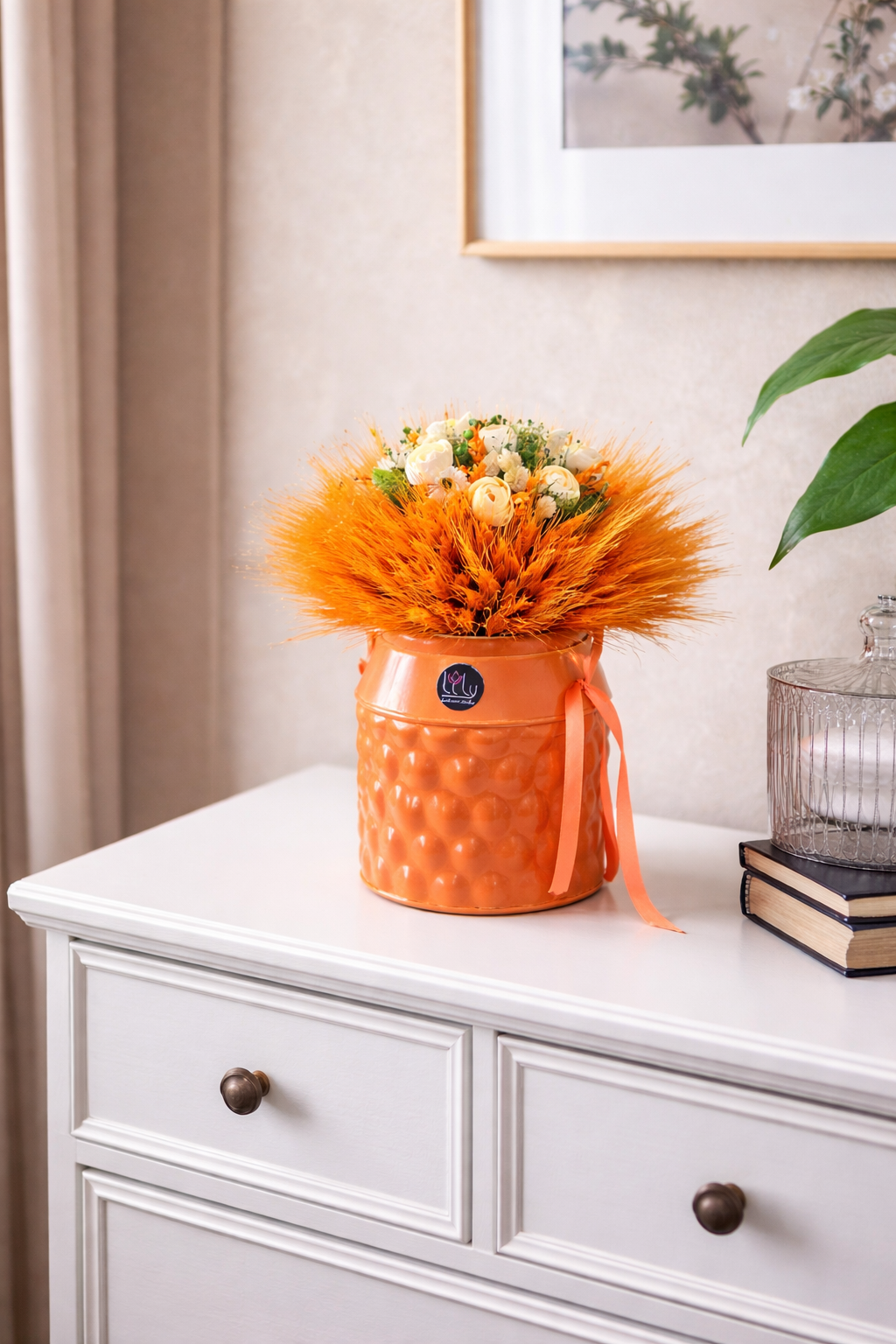 Originálny aranžmán v štýlovej plechovej váze v teplých oranžových odtieňoch prinesie do interiéru pocit útulnosti a harmónie. Kombinácia jemných krémových ruží, drobných kvietkov a výrazných sušených prvkov vytvára zaujímavý kontrast, ktorý okamžite upúta pozornosť.