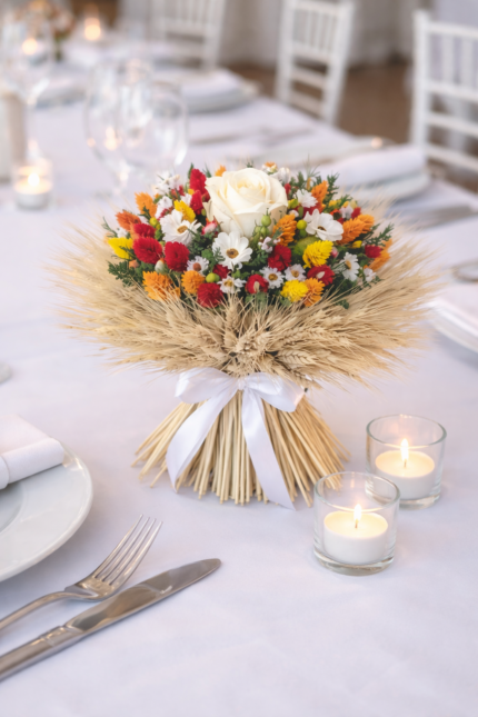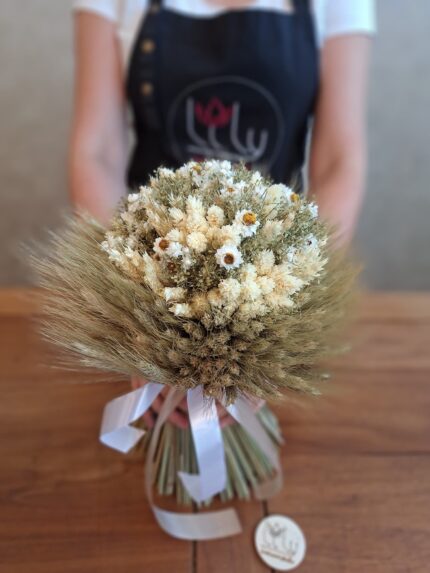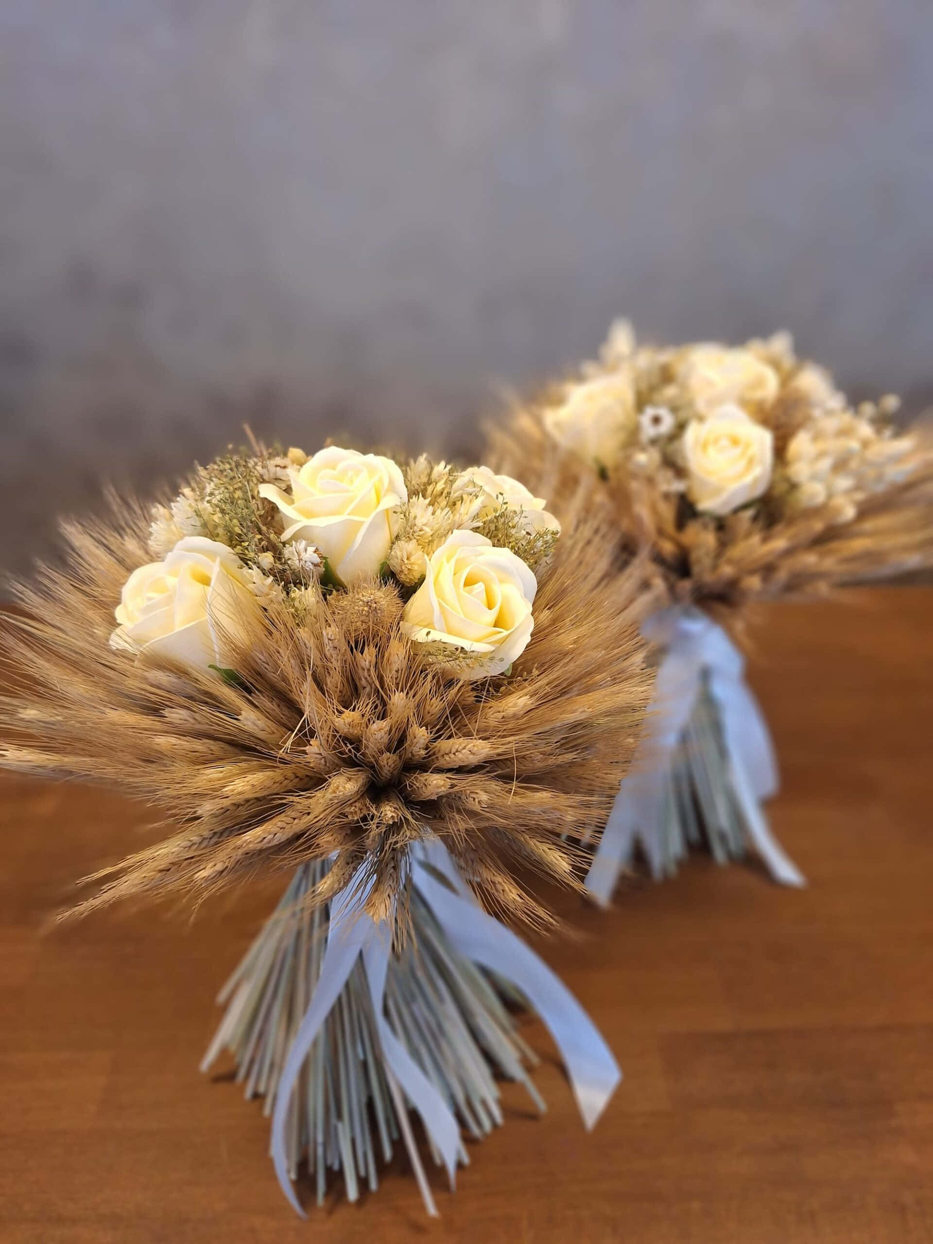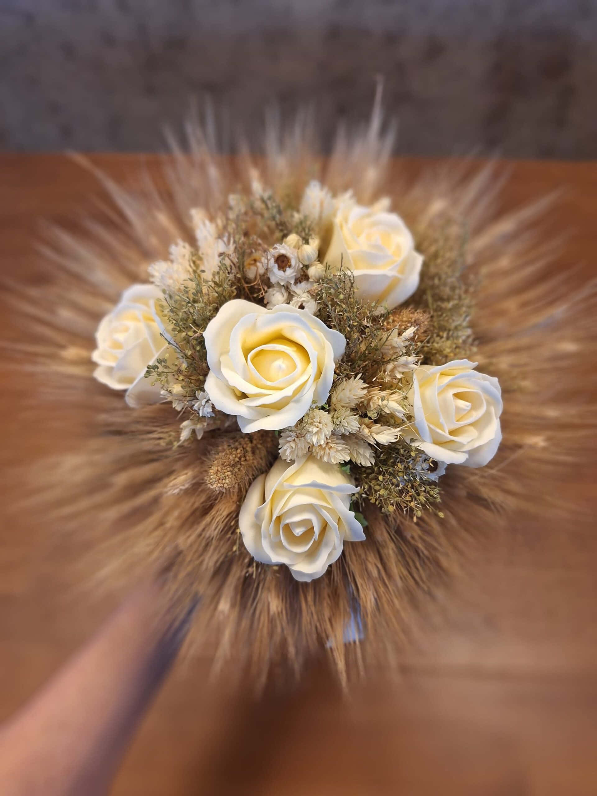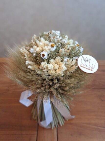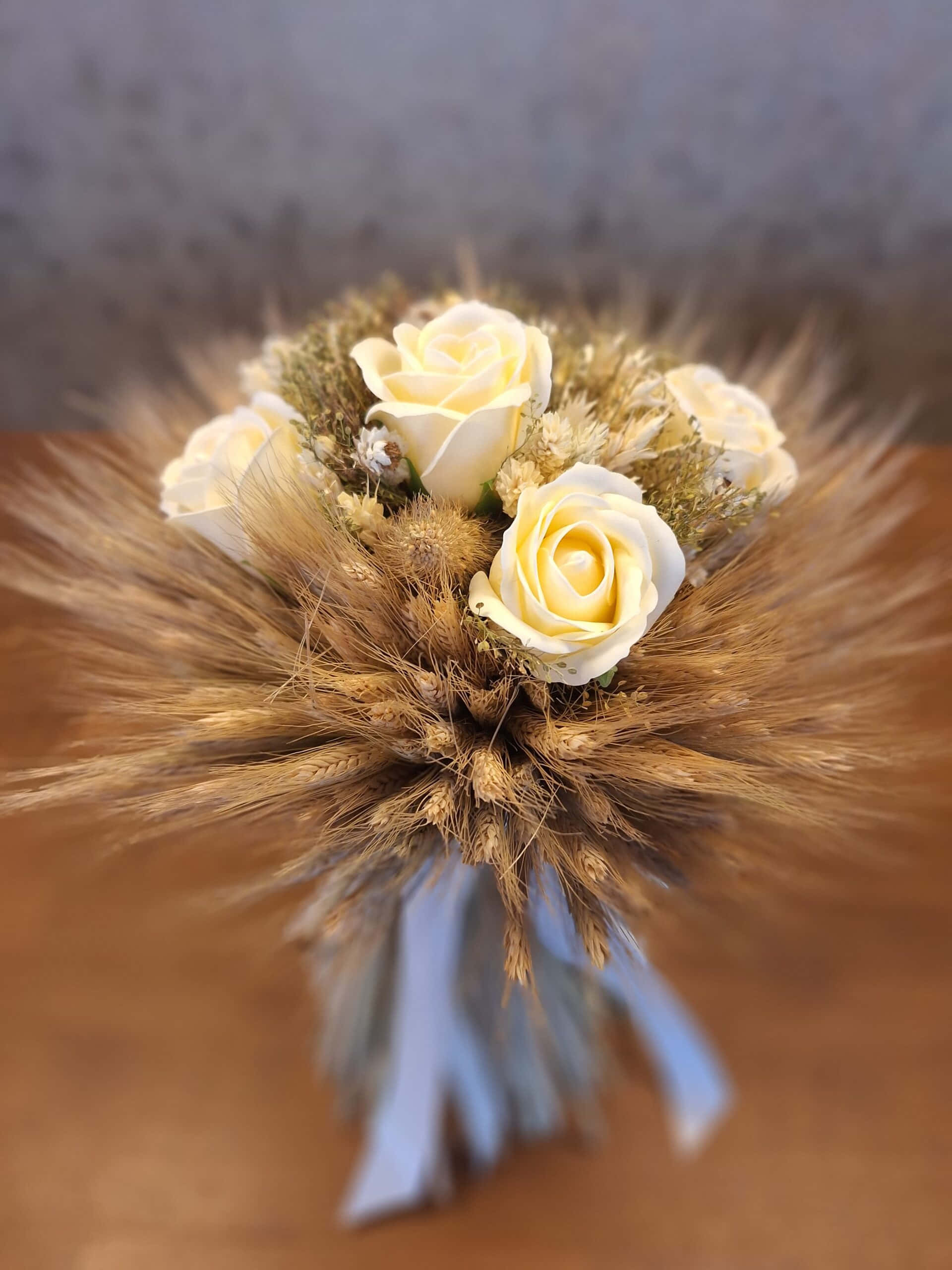 Ak hľadáte jedinečnú kyticu ktorá očarí, tak ste ju našli. Kytica je strednej veľkosti, ručne viazaná zo sušených kvetov,doplnená o látkové rúže.