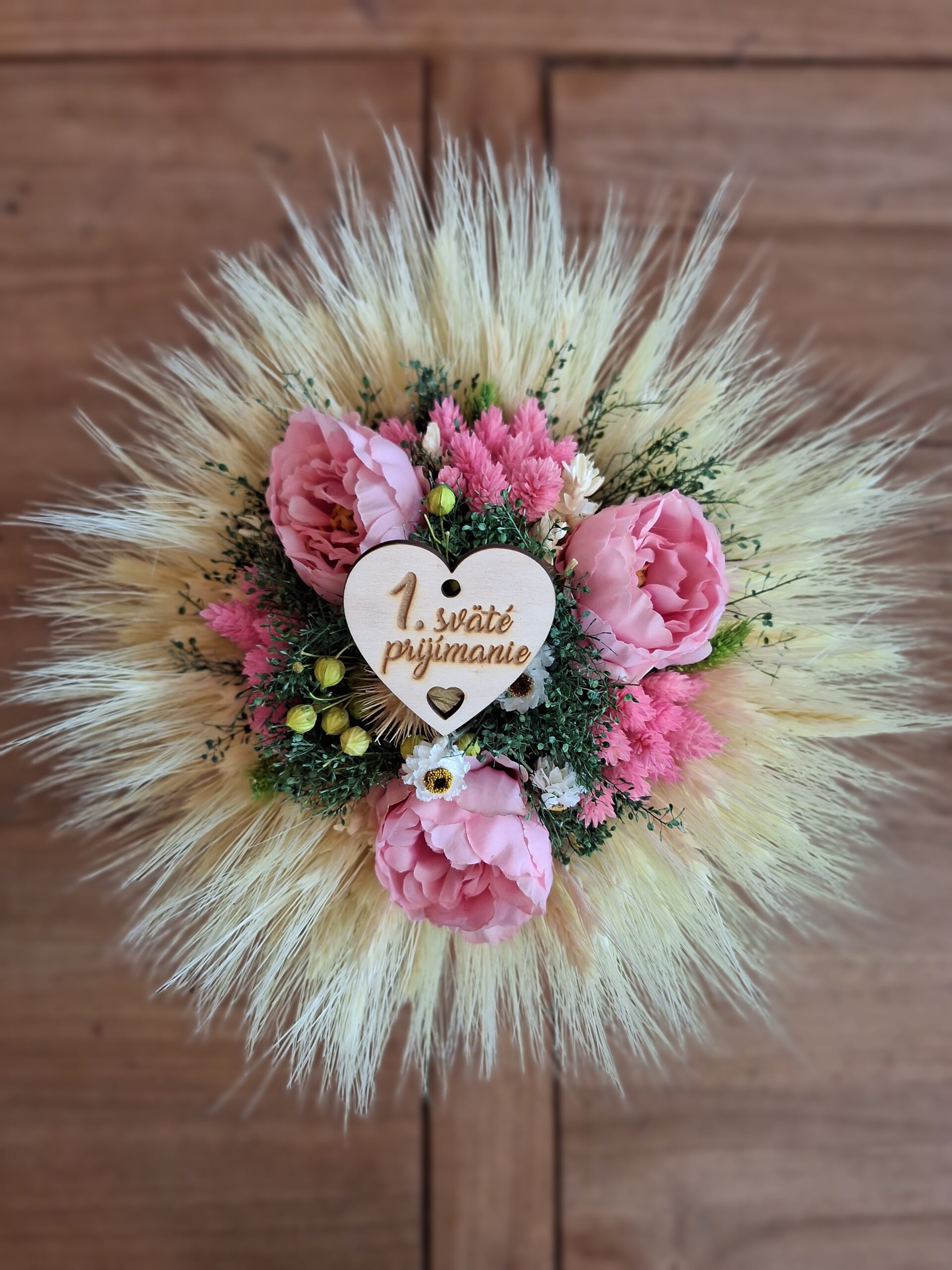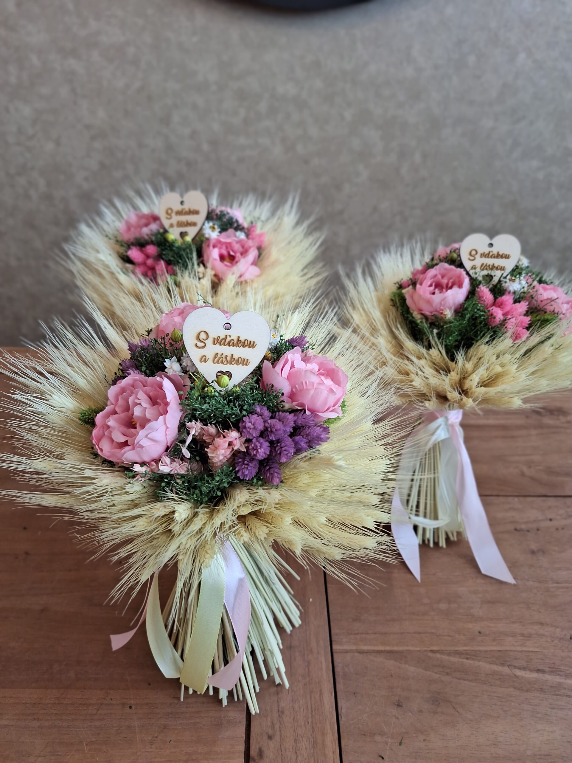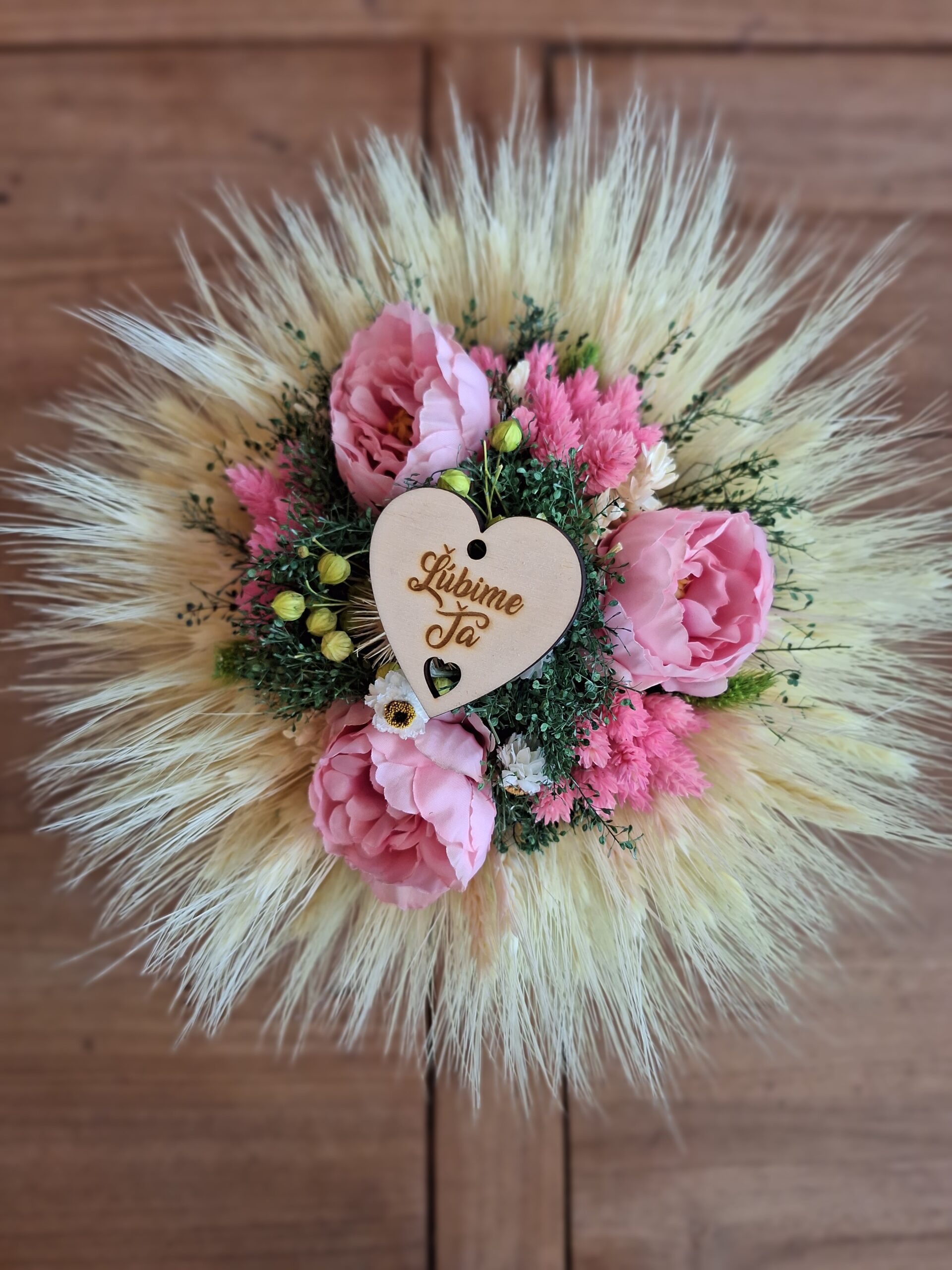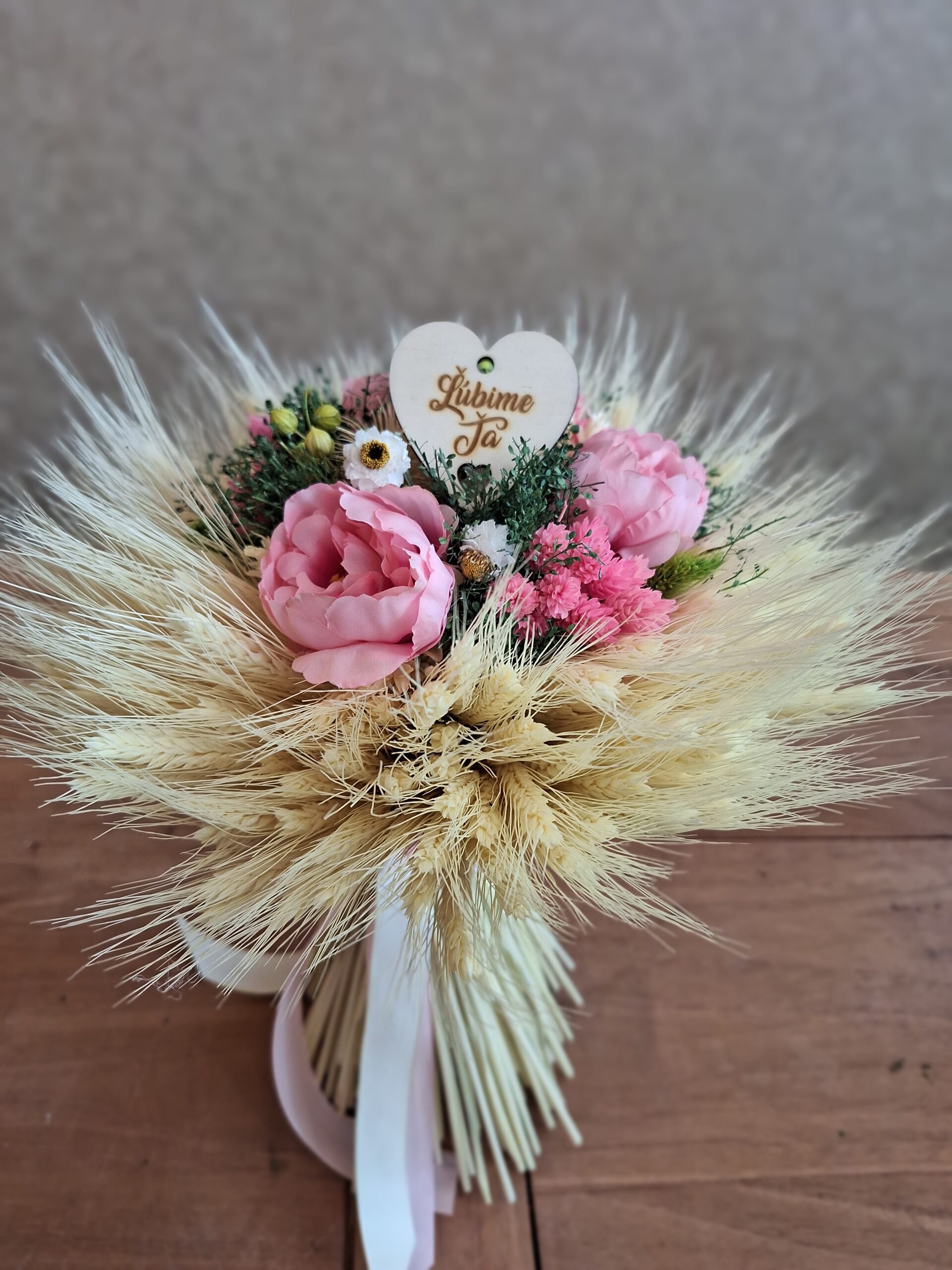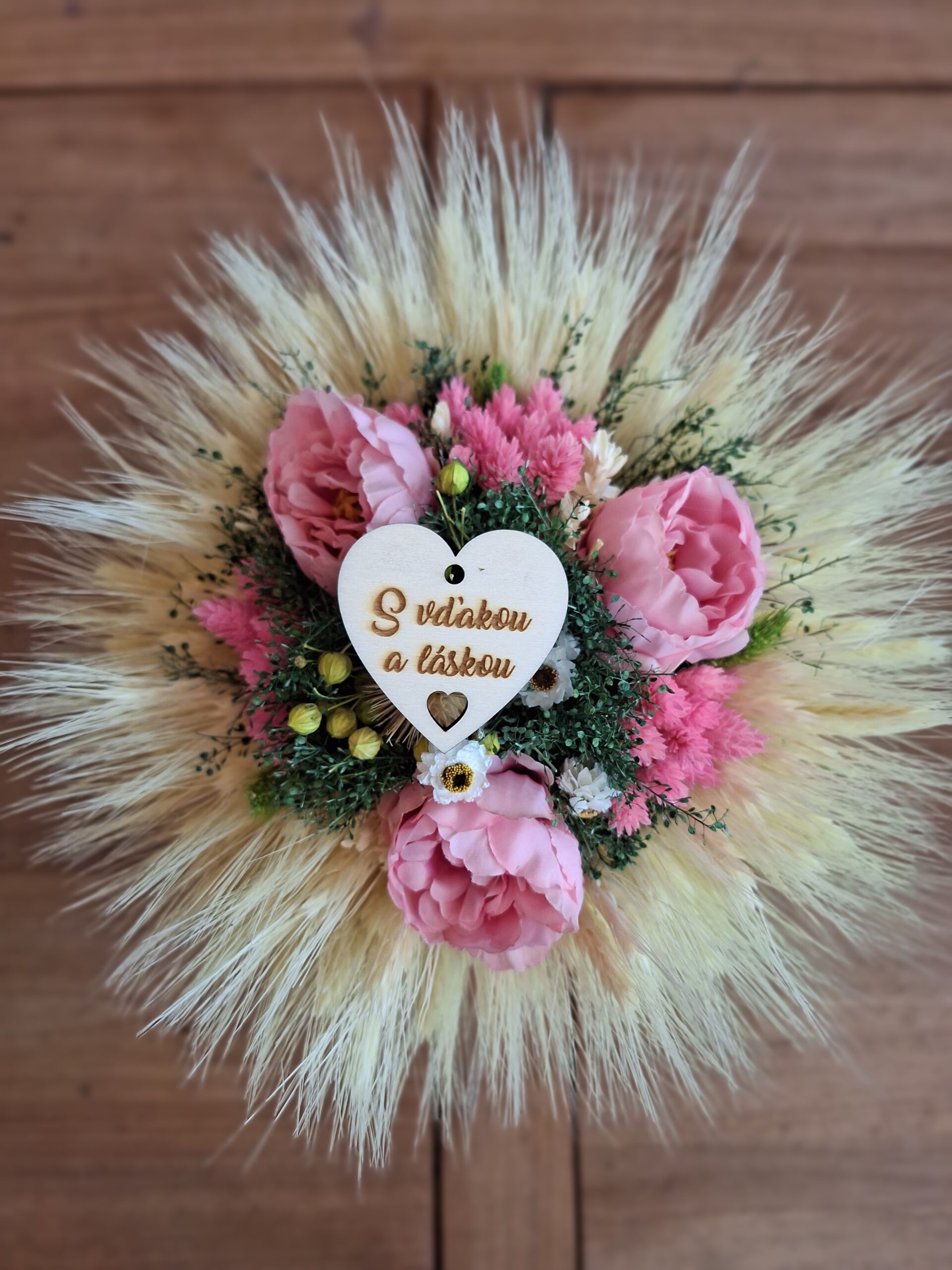 Táto krásna sušená kytica poteší Vašu mamku. Kytica je ručne viazaná zo sušených kvetov doplnená o drevené srdiečko.