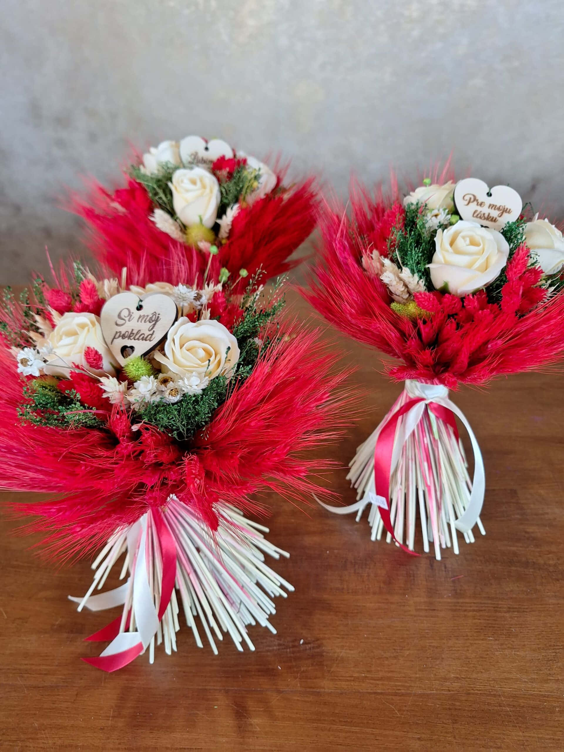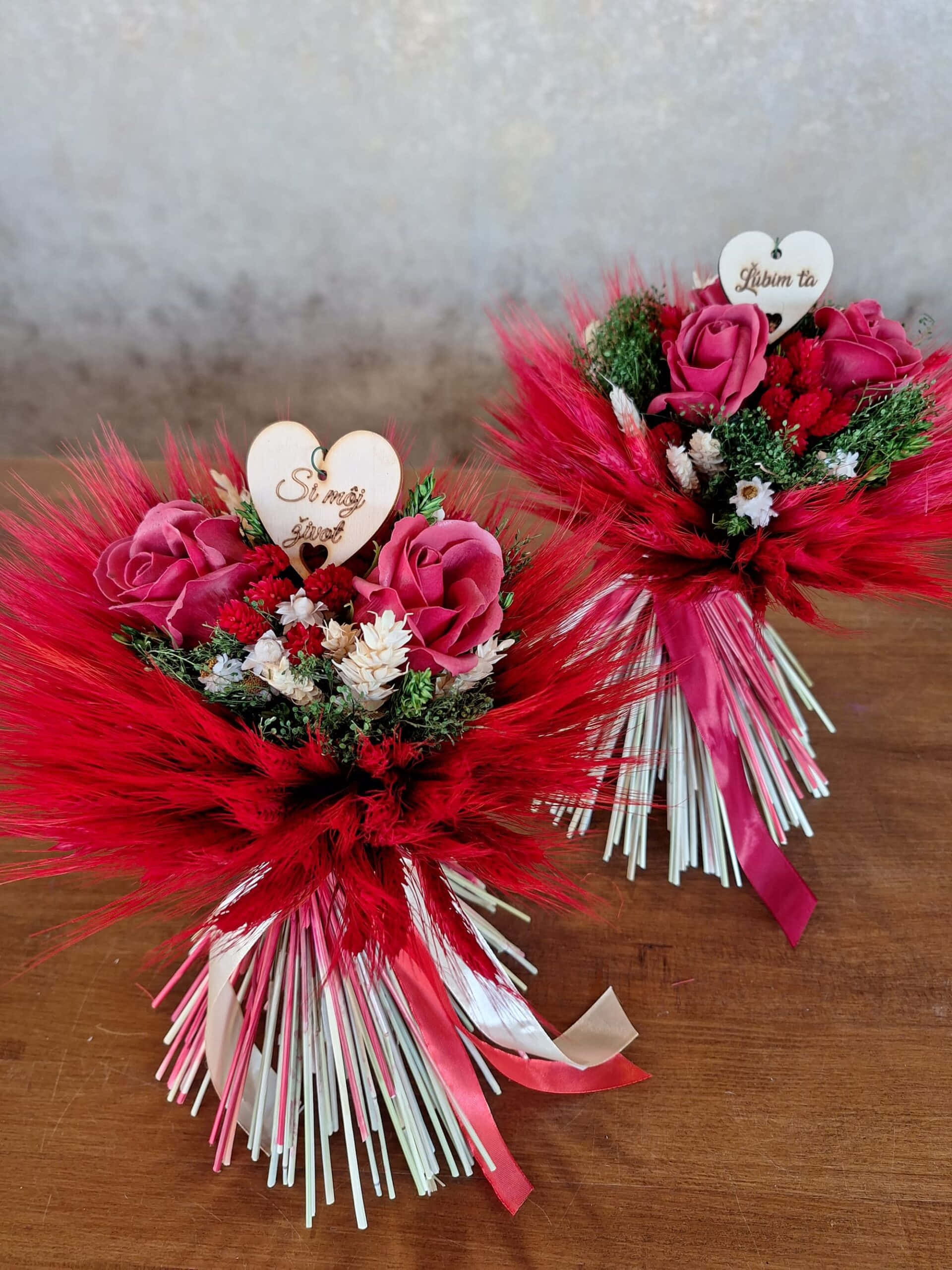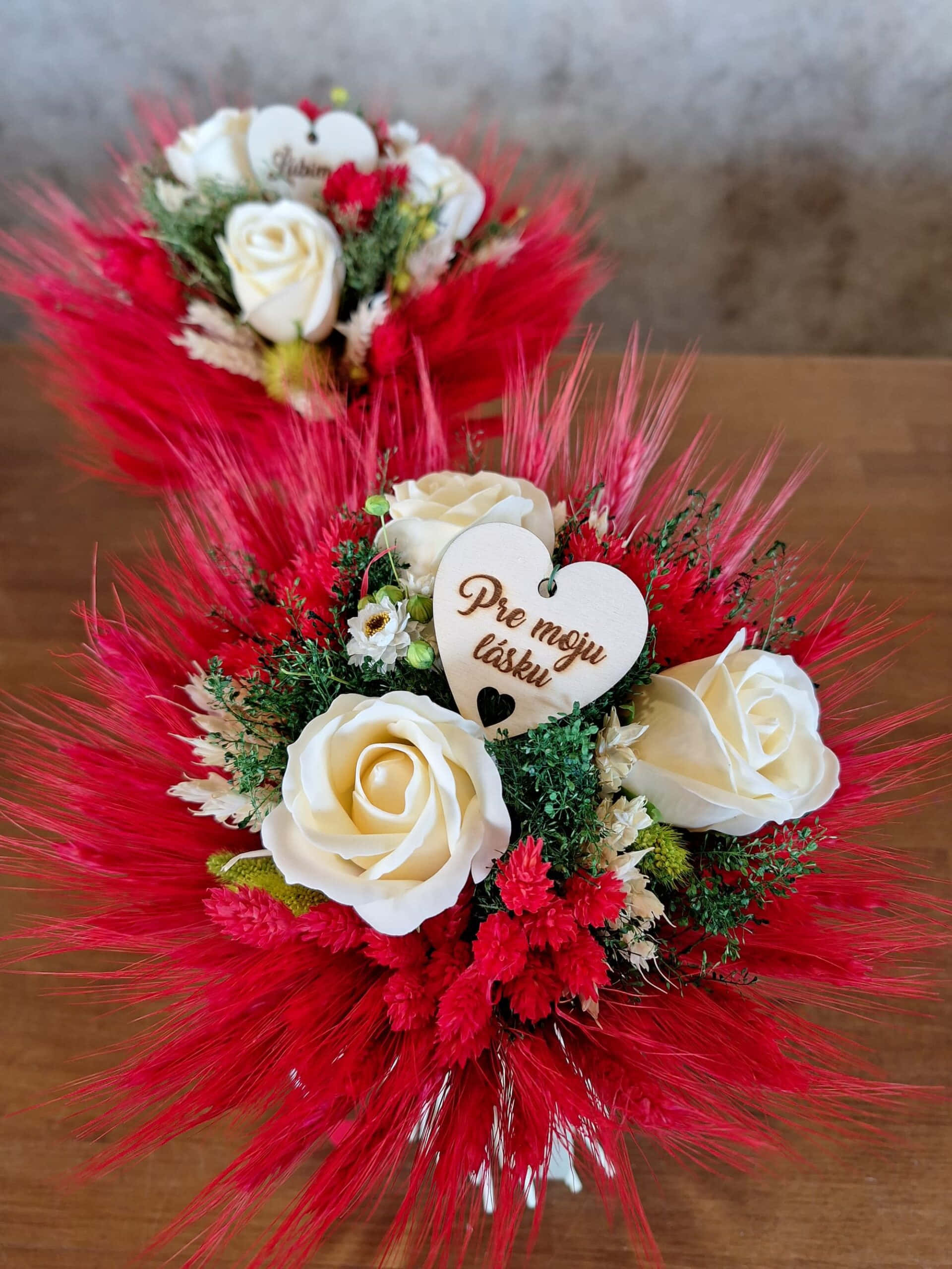 Je doplnená ružami a dreveným srdiečkom s textom.