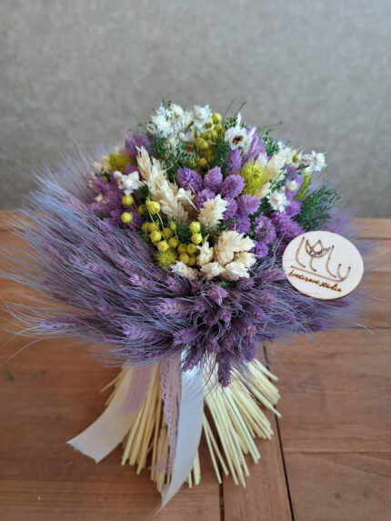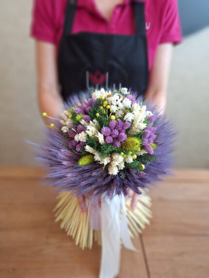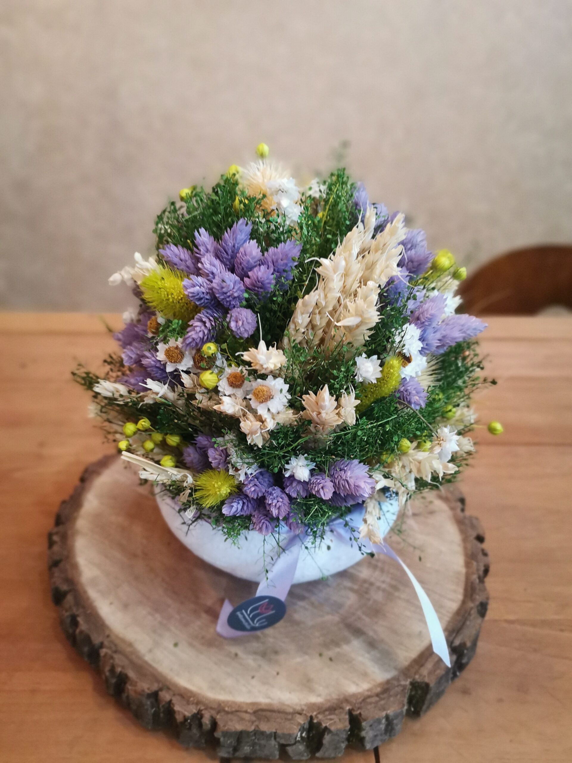 Tento sušený aranžmán je ručne viazaný do guľe. Kvety sú položené v keramickej nádobe. Krásna dekorácia na Váš stôl.
