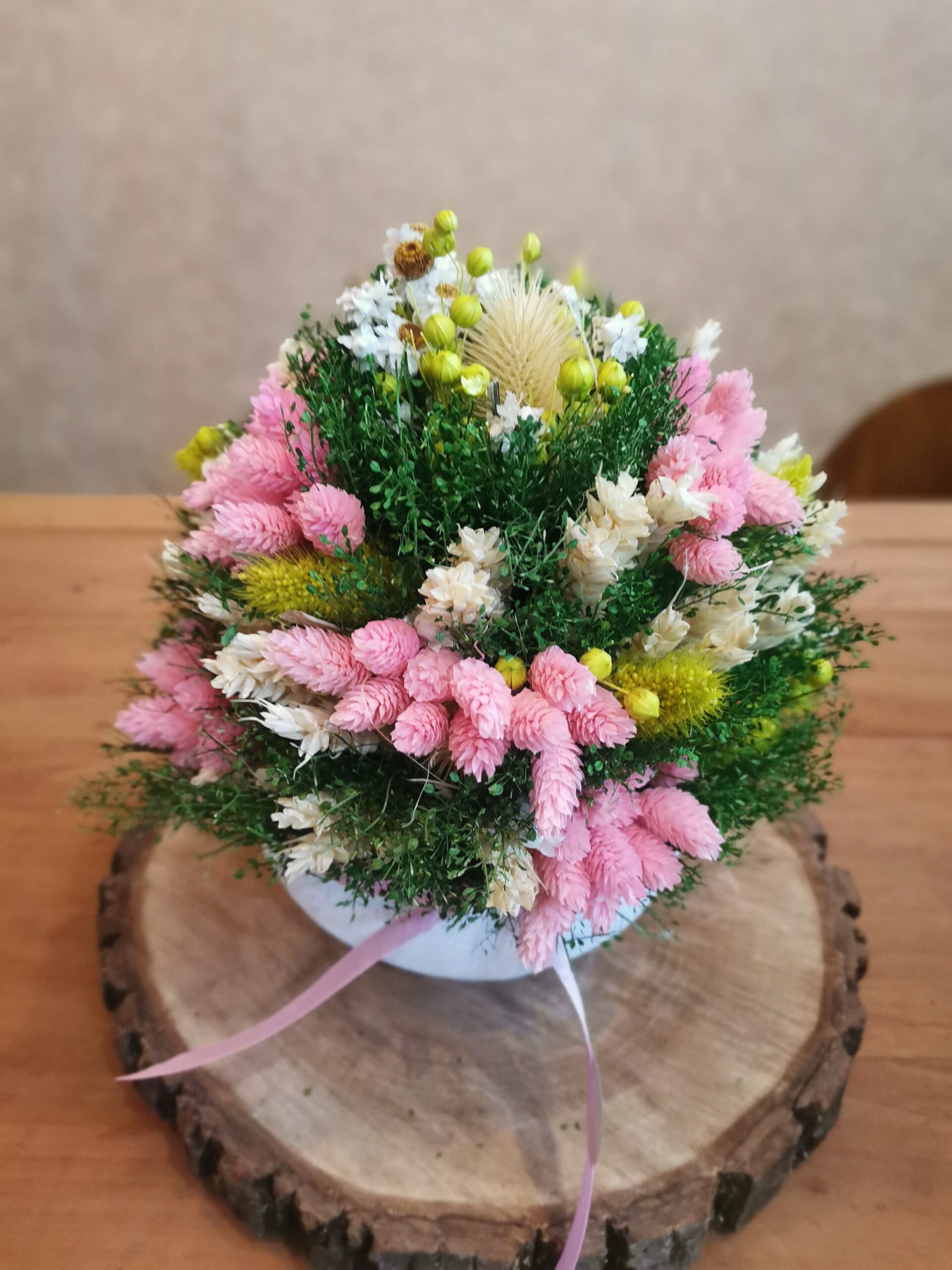 Krásny sušený aranžmán je ručne viazaný do guľe. Kvety sú položené v keramickej nádobe. Krásna dekorácia na Váš stôl.