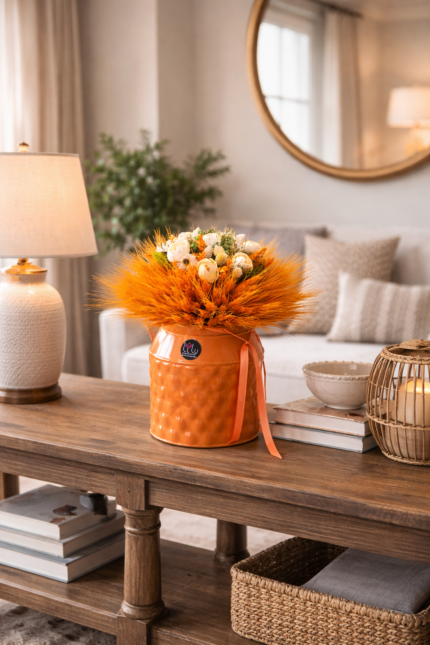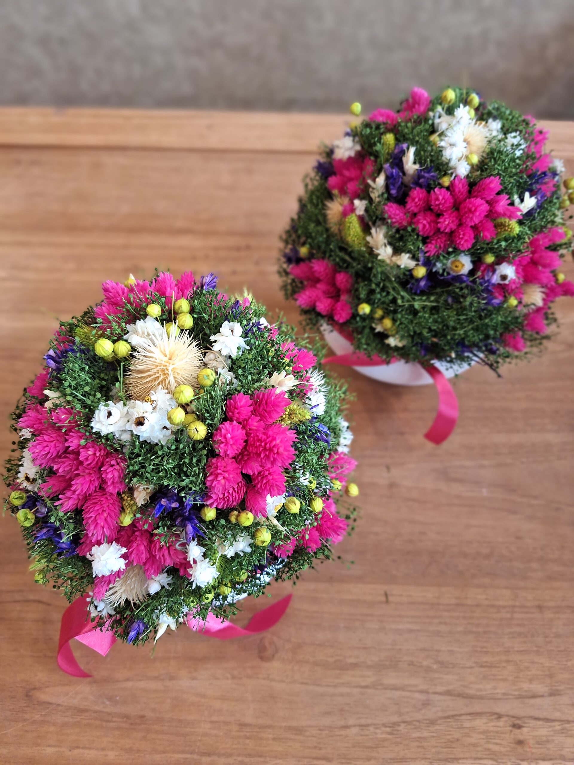 Krásny sušený aranžmán je ručne viazaný do guľe. Kvety sú položené v keramickej nádobe. Krásna dekorácia na Váš stôl.