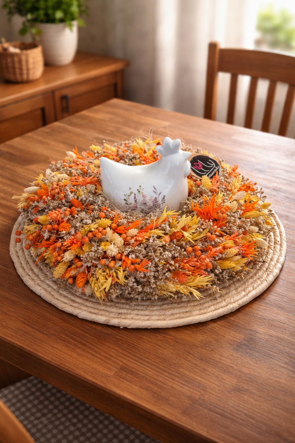 Umiestnený na stole v kuchyni alebo obývačke pôsobí veľmi útulne a štýlovo. Stred venčeka dopĺňa keramická sliepočka, vďaka ktorej je dekorácia ideálna najmä na jar a Veľkú noc, no poteší počas celej sezóny.