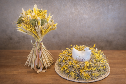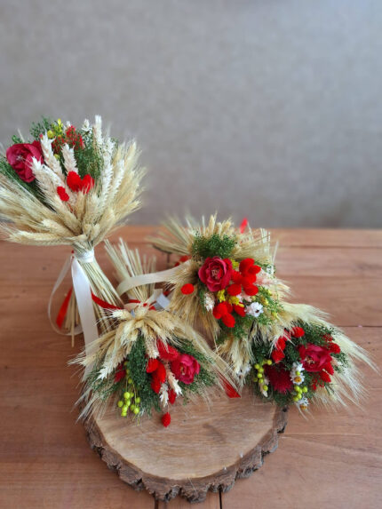 Svadobná kytica naviazaná zo sušených slamienok doplnená o sušené prírodné klasy. Kytica je doplnená o pierko so zapínaním. Set Vám vieme naviazať do pár dní.