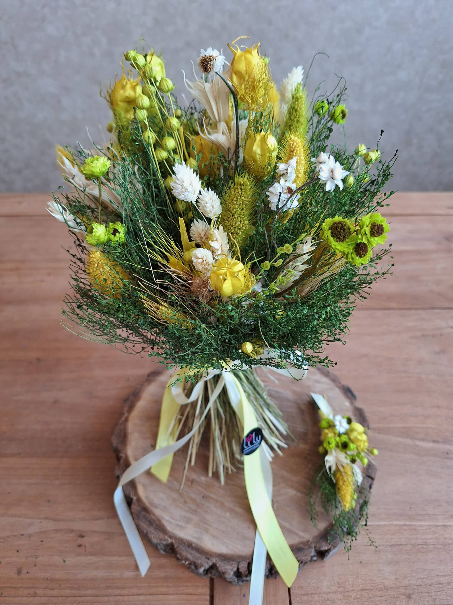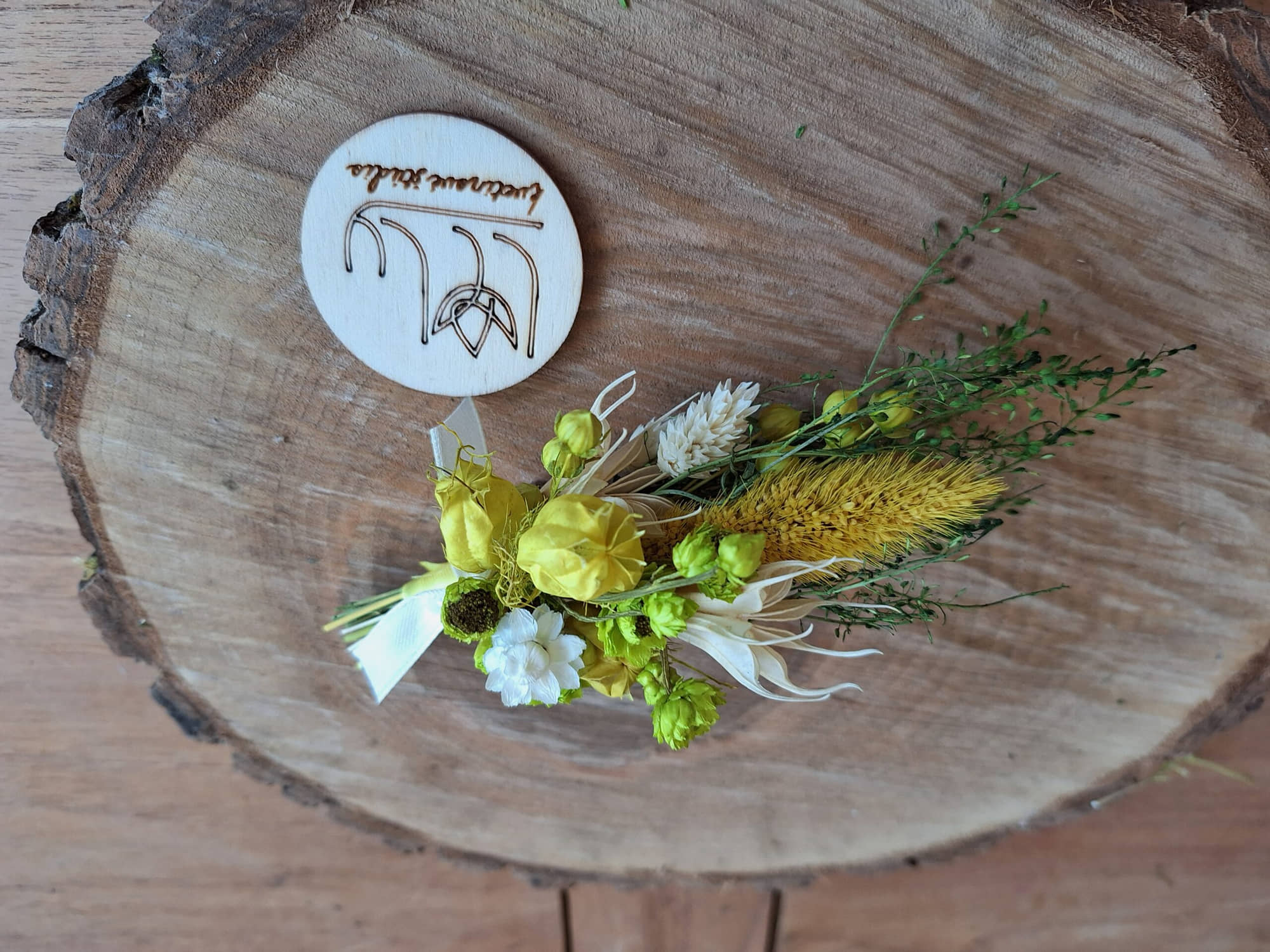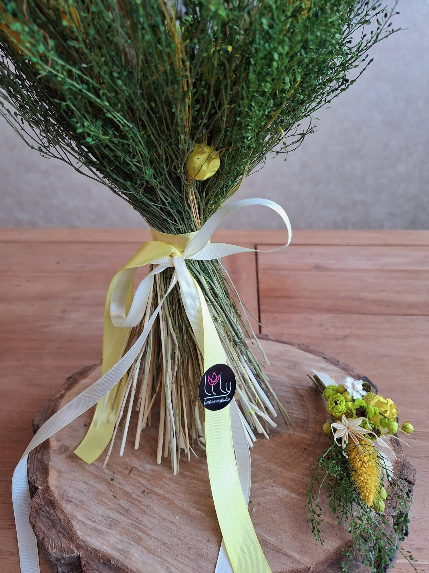 Krásny handmade svadobný set .Set obsahuje sušenú kyticu pre nevestu a k tomu pierko pre ženícha s jednoduchým zapínaním. Ideálne pre romantickú dušu.