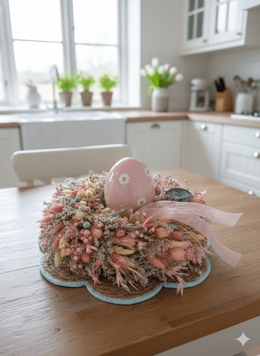 Hľadáte ručne tvorenú dekoráciu, ktorá dýcha jarou a vydrží vám dlhé roky? Tento aranžmán je spojením tradície a prírodnej estetiky, vytvorený z materiálov, ktoré nestrácajú na kráse.
