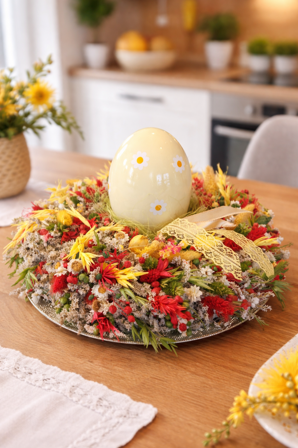Dominantou venca je krásne žlté keramické vajíčko s jemným kvetinovým detailom, ktoré je bezpečne usadené v bohatom základe zo sušených rastlín. Celá kompozícia je umiestnená na striebornom ozdobnom podnose, ktorý dodáva dekorácii punc luxusu a uľahčuje jej manipuláciu.