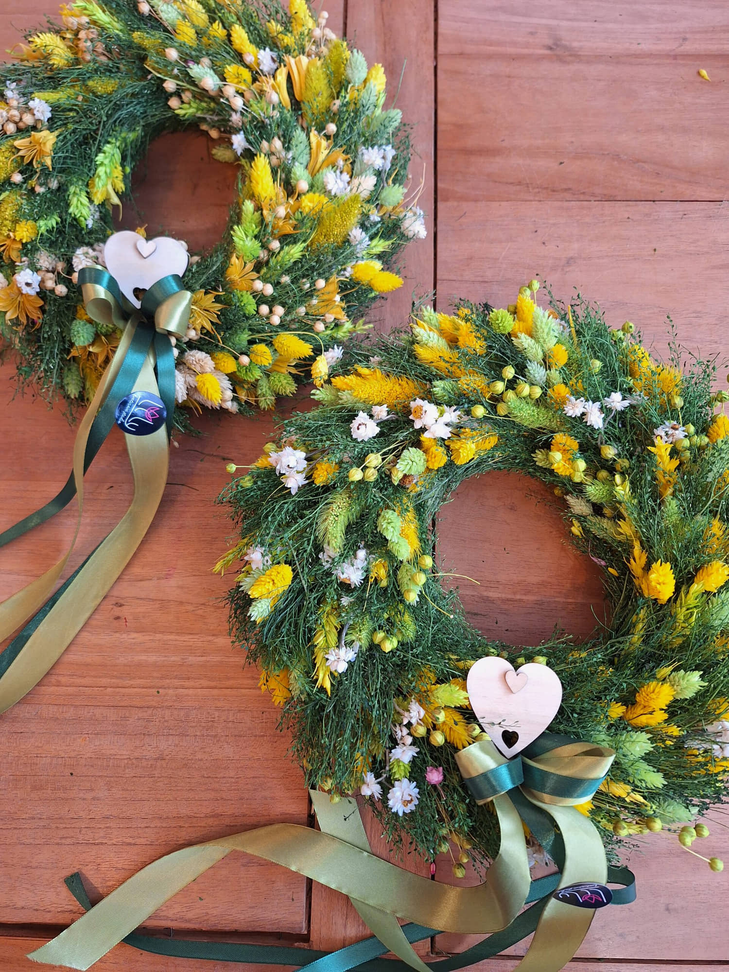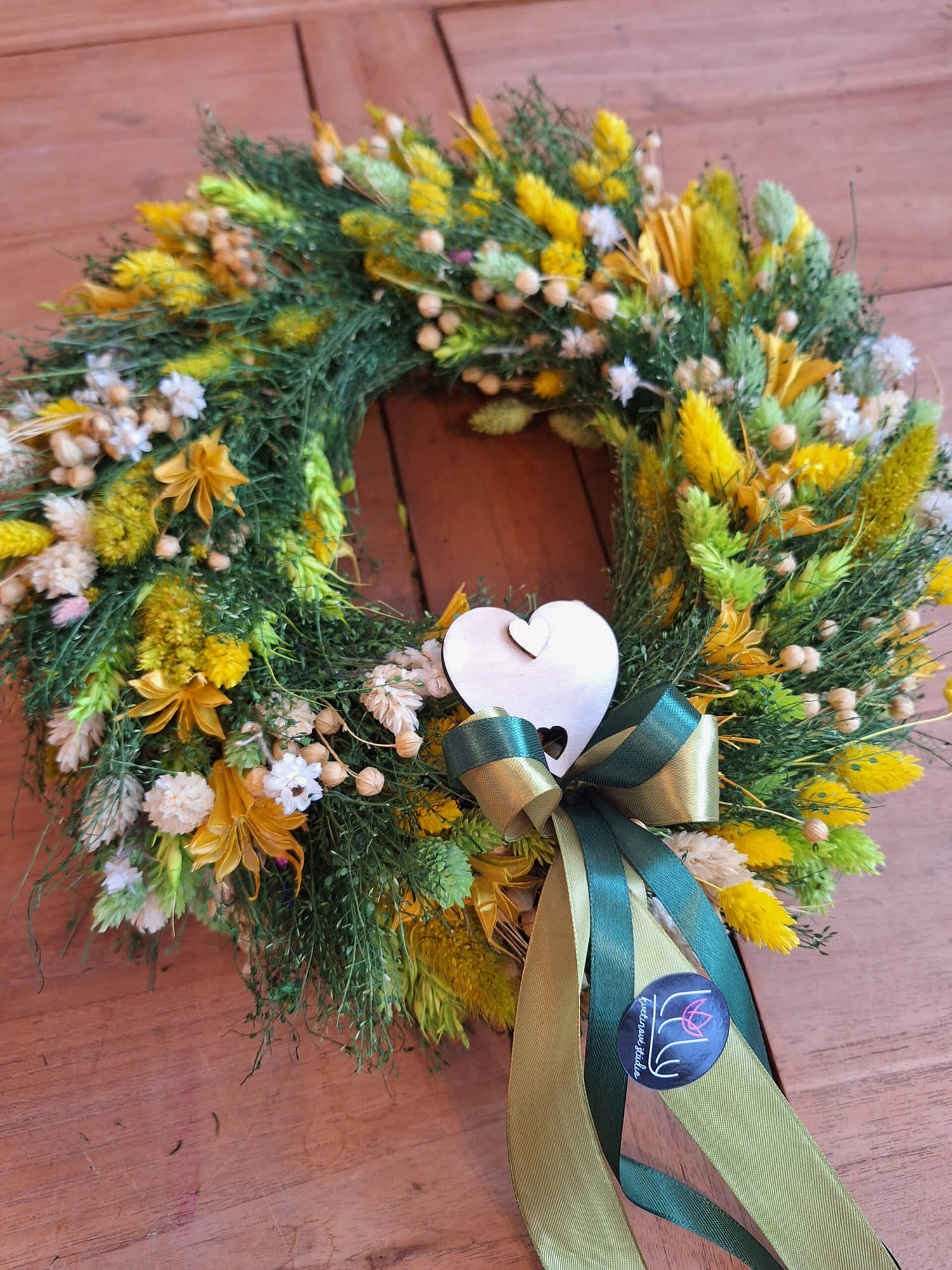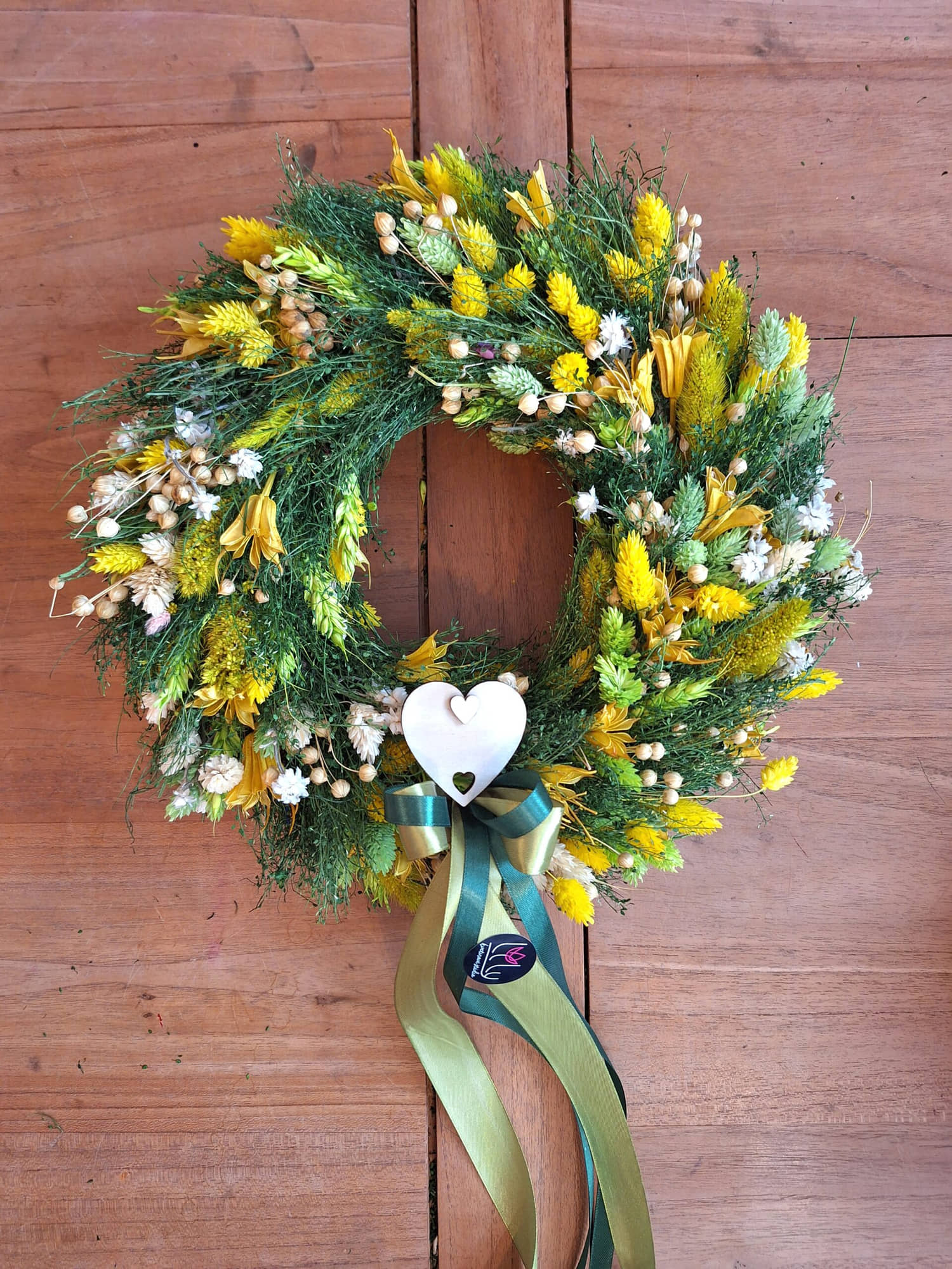 Krásny ručne viazaný venček z rôznych druhov sušených kvetov. Kvety sú viazané na slamenom základe. Venček je doplnený o stuhy a drevené srdiečko.