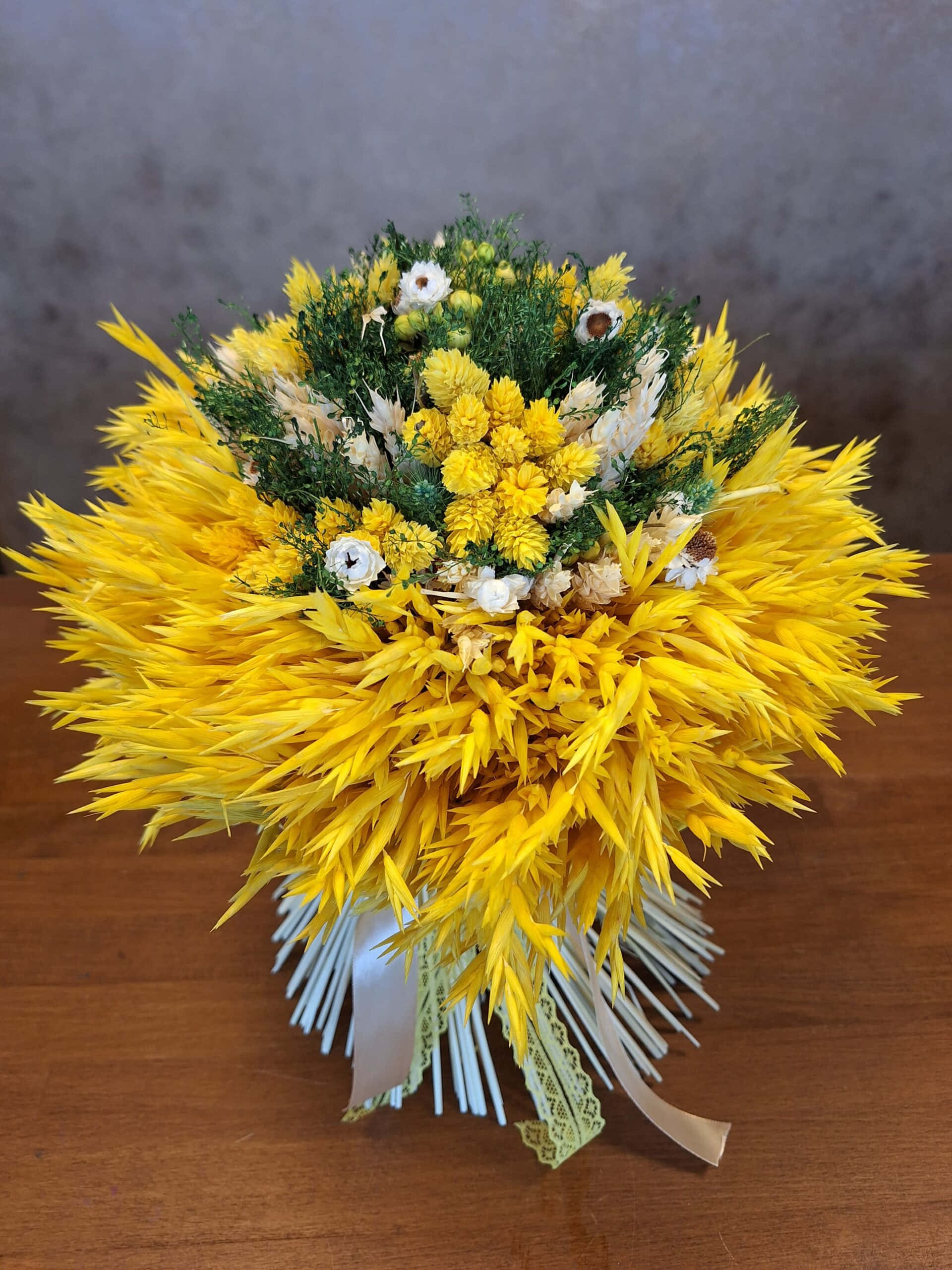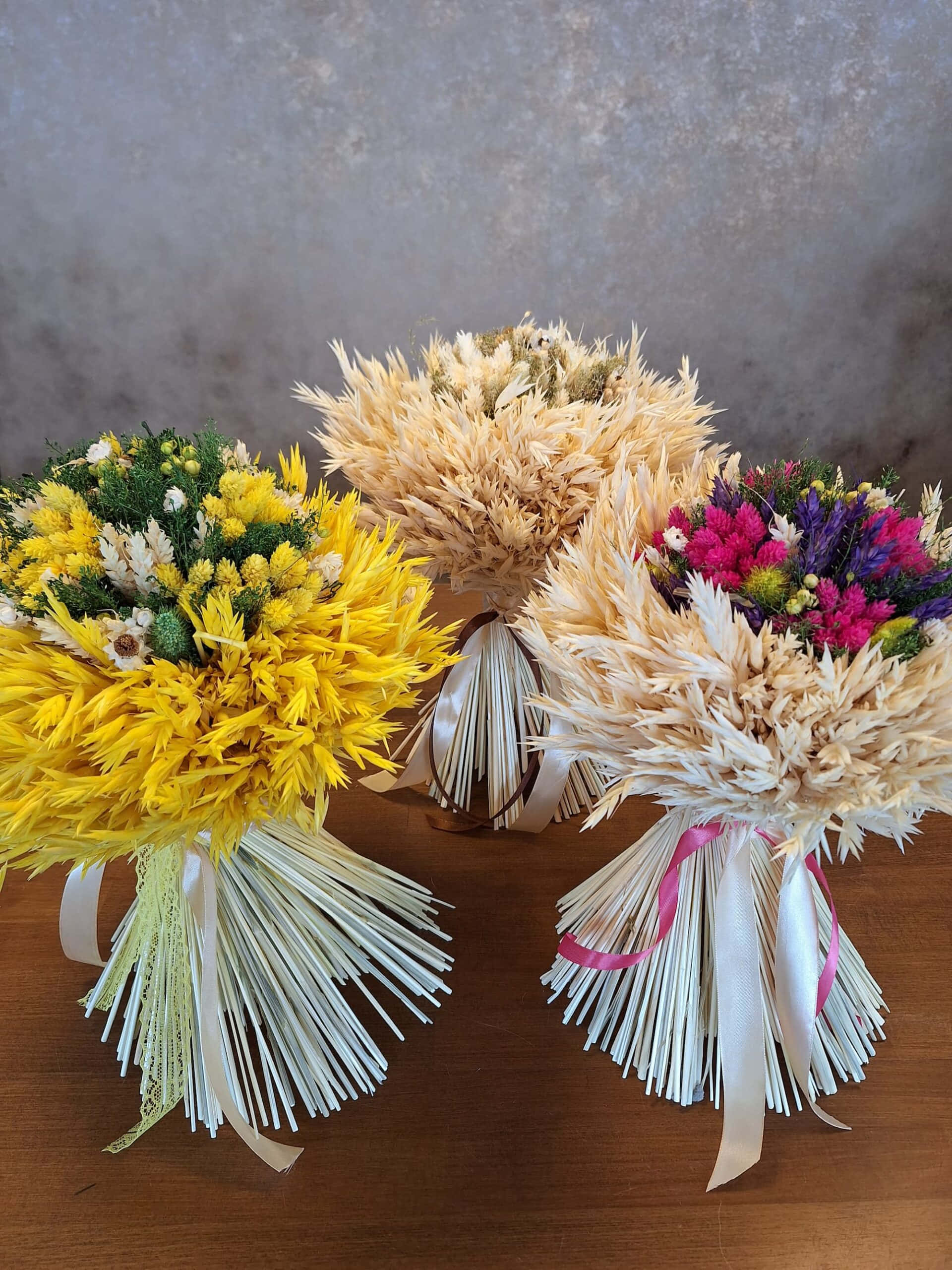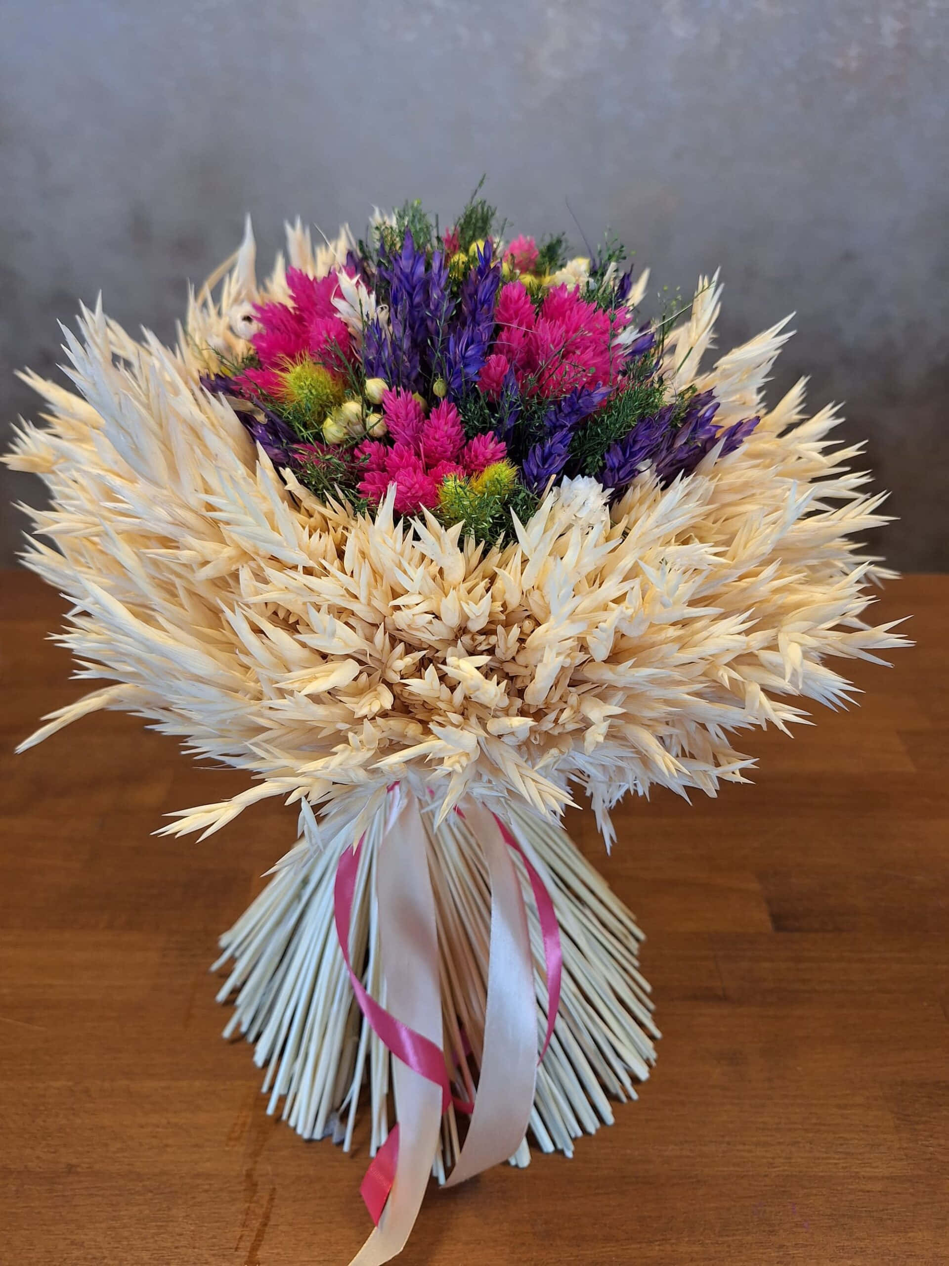 Krásna žiarivá kytica je ručne viazaná zo sušených drobných kvetov, doplnená o ovsené klasy.