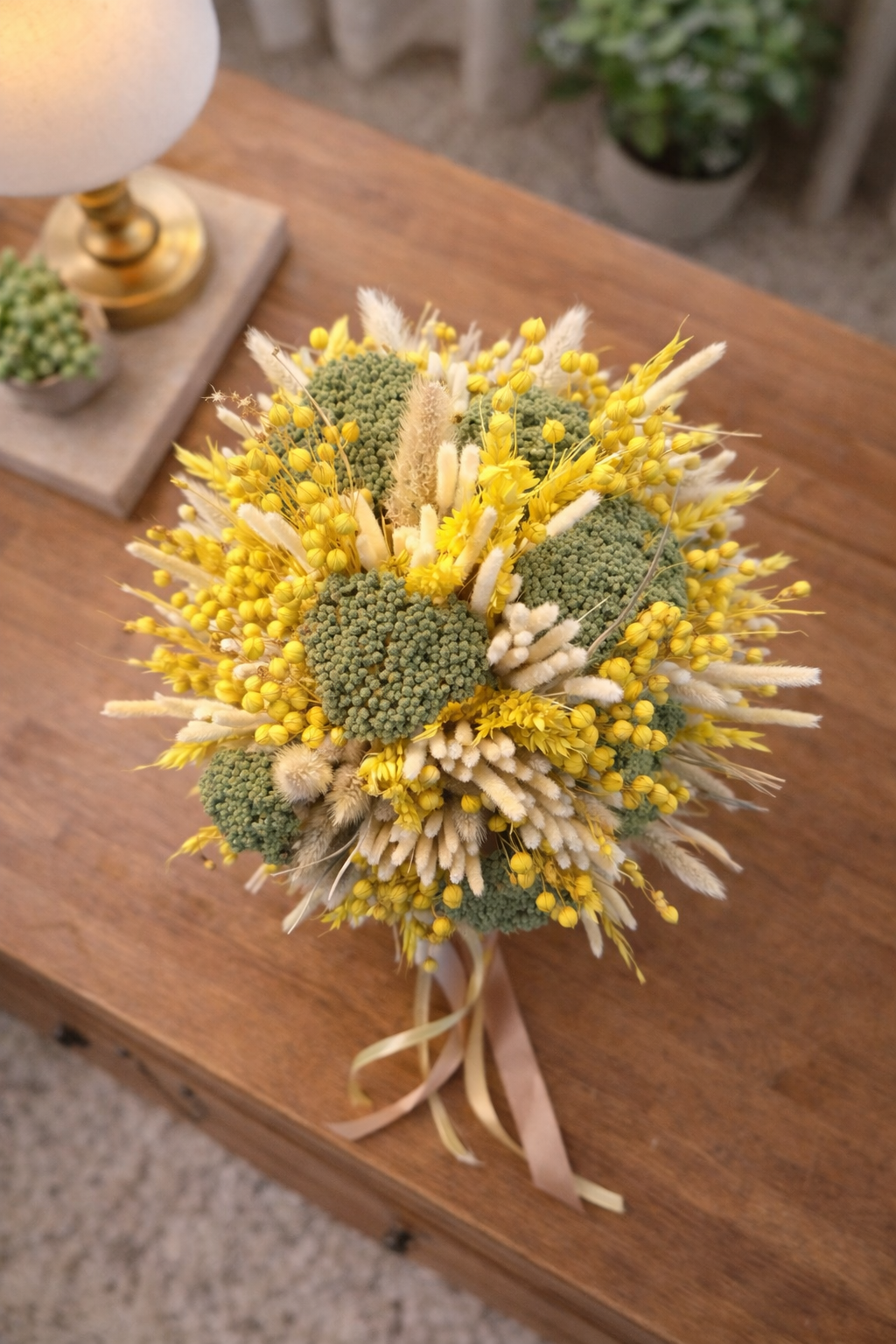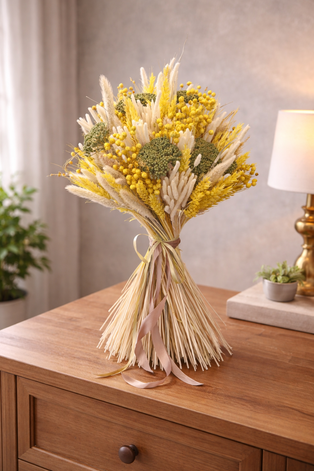 Elegantná sušená kytica v žlto-prírodnom prevedení je nadčasovou dekoráciou, ktorá rozžiari každý interiér. Ručne viazaná kytica s výškou približne 40 cm je zložená zo sušených obilnín, lagurusu (zajačie chvostíky), drobných sušených kvietkov a prírodných semenných hláv v harmonickej kombinácii žltej, krémovej a jemne zelenej farby.