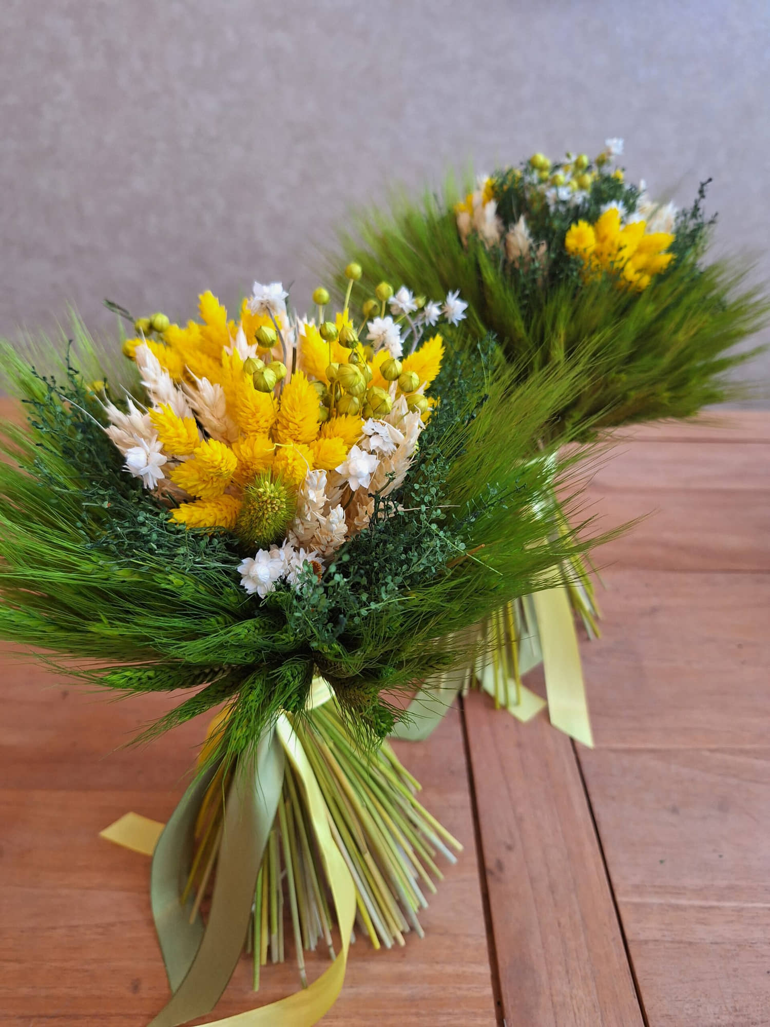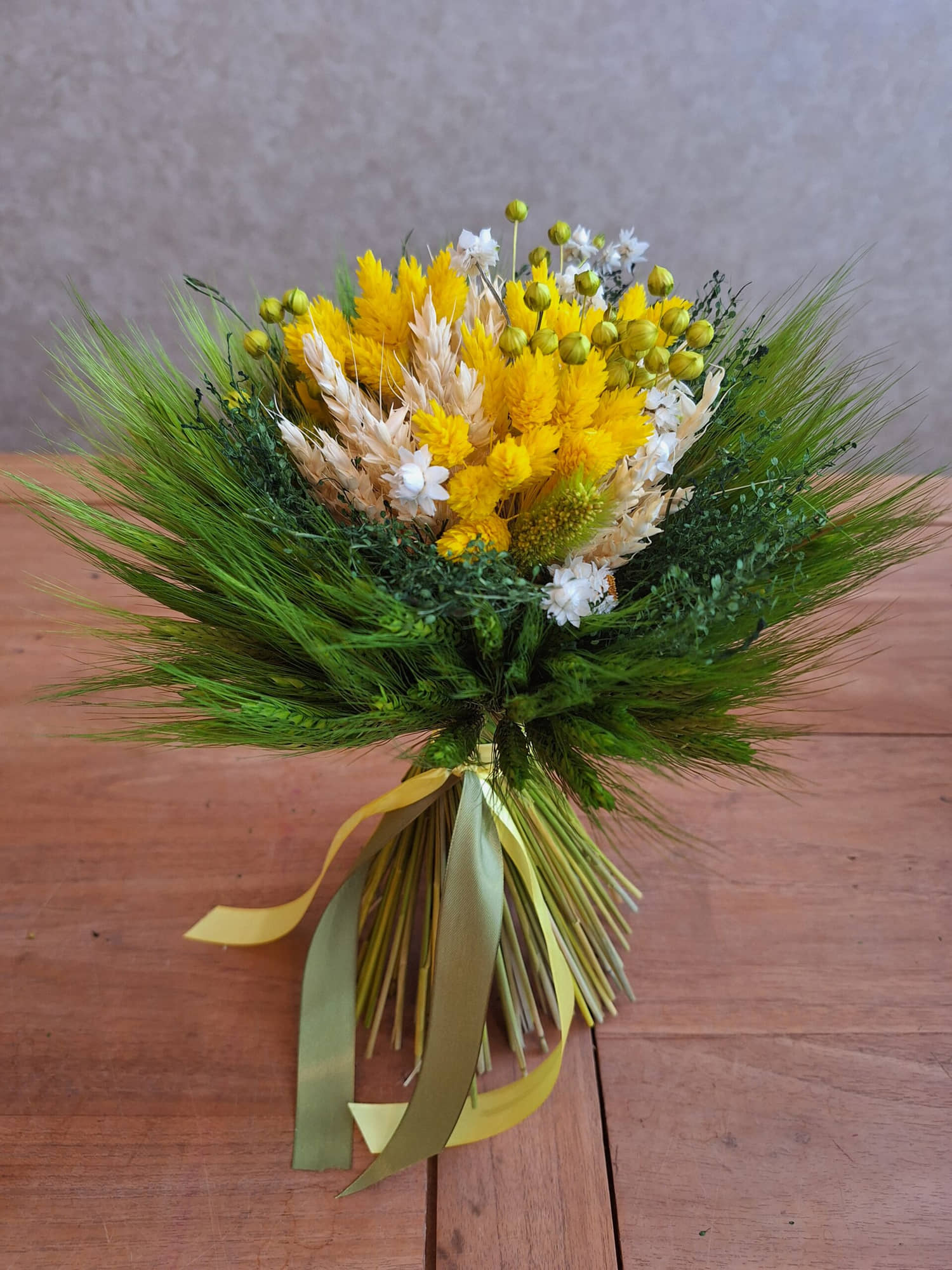 Stredná kytica je viazaná z obilných klasov. Vnútro tvorí mix sušených kvetov .